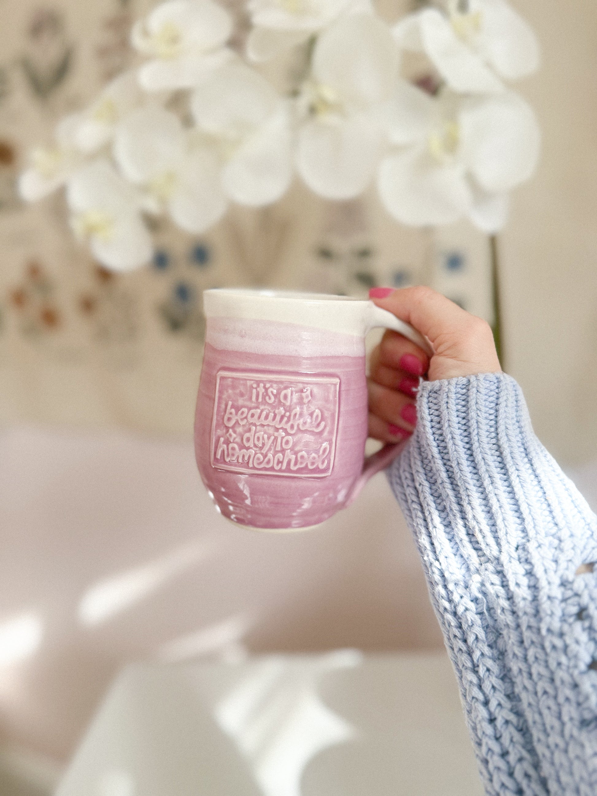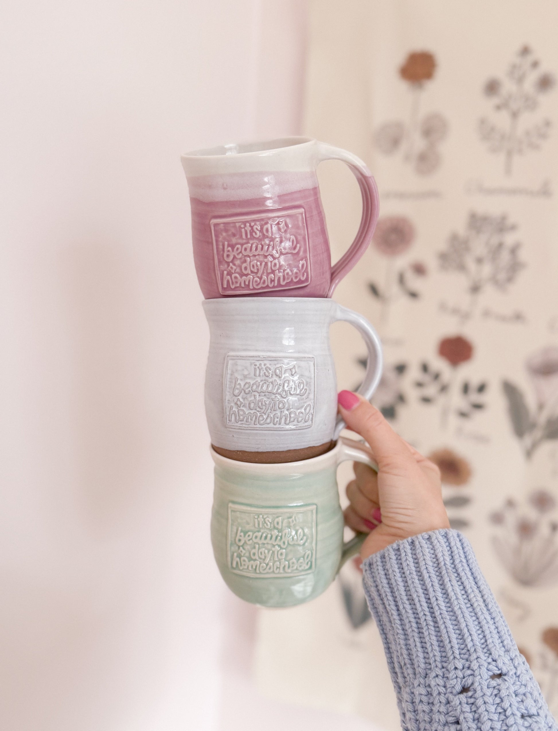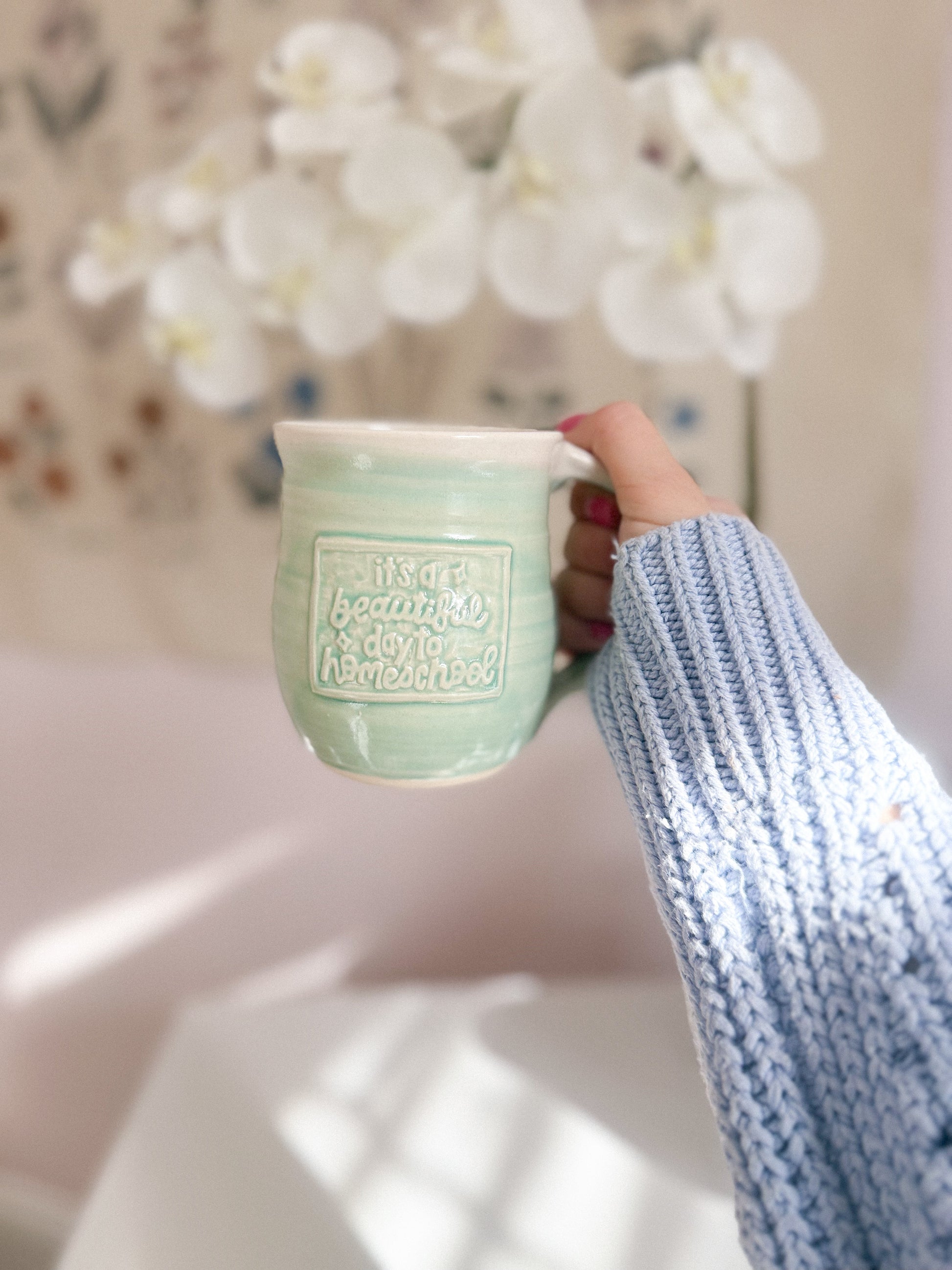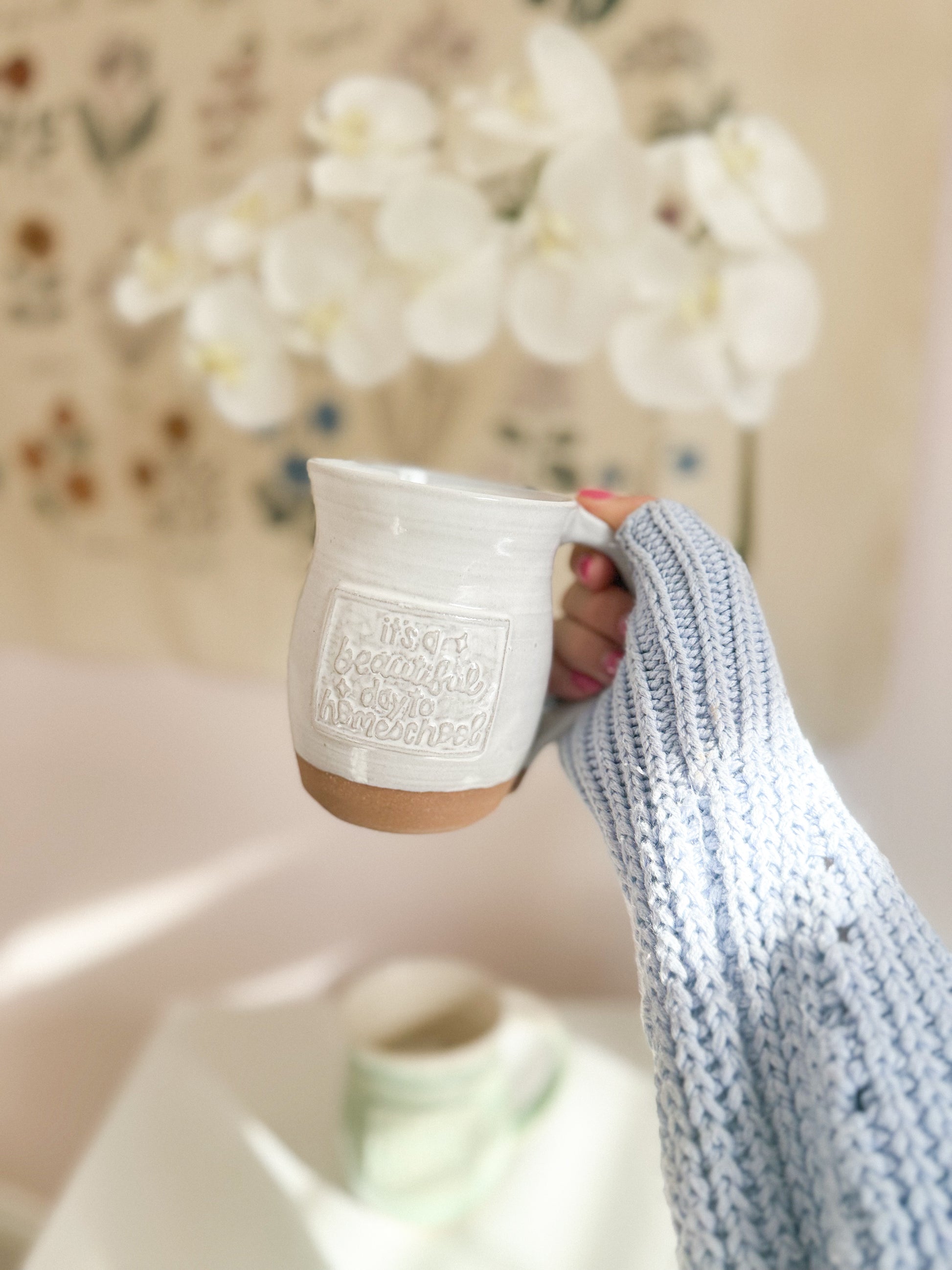 The very definition of a “hug in a mug!” Our popular Beautiful Day design is now available on these stunning handmade mugs. Each mug is hand thrown and is finished with a hand carved medallion. These are so incredibly special and they are THE MOST COMFY to hold. You will absolutely be grabbing for this mug everyyyy day! This beauty holds roughly 15oz!