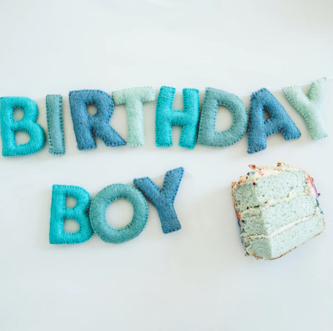 Our Birthday Boy garland is made from 100% wool felt that has been stuffed and sewn for a 3D effect. Each end of the garland has a loop for easy hanging. There are no knots in the string in order to make spacing customizable with a gentle tug. Letters are 3 in or 7.5 cm high.