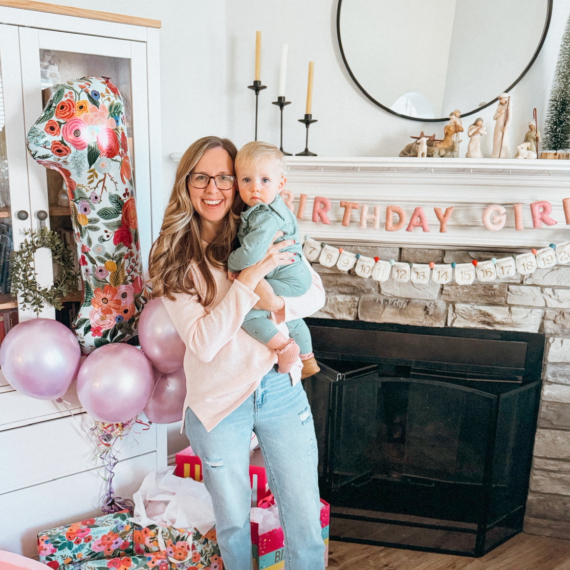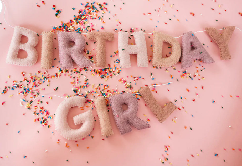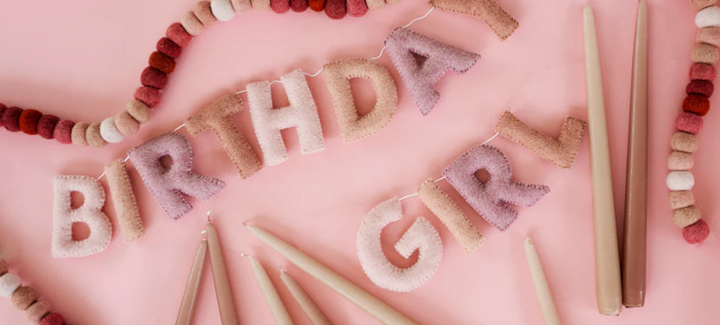 Our Birthday Girl garland is made from 100% wool felt that has been stuffed and sewn for a 3D effect. Each end of the garland has a loop for easy hanging. There are no knots in the string in order to make spacing customizable with a gentle tug.
