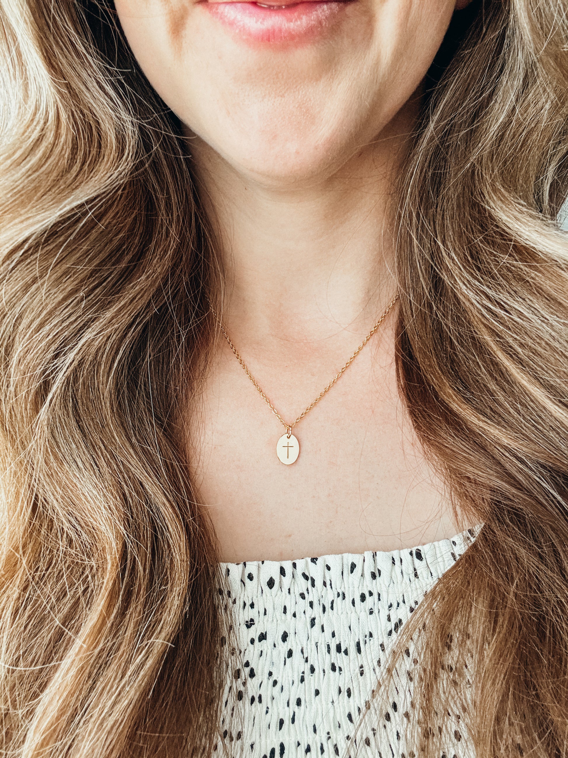 Our Cross Pendant Necklace is 18k gold plated and the chain is 17.5” long.
