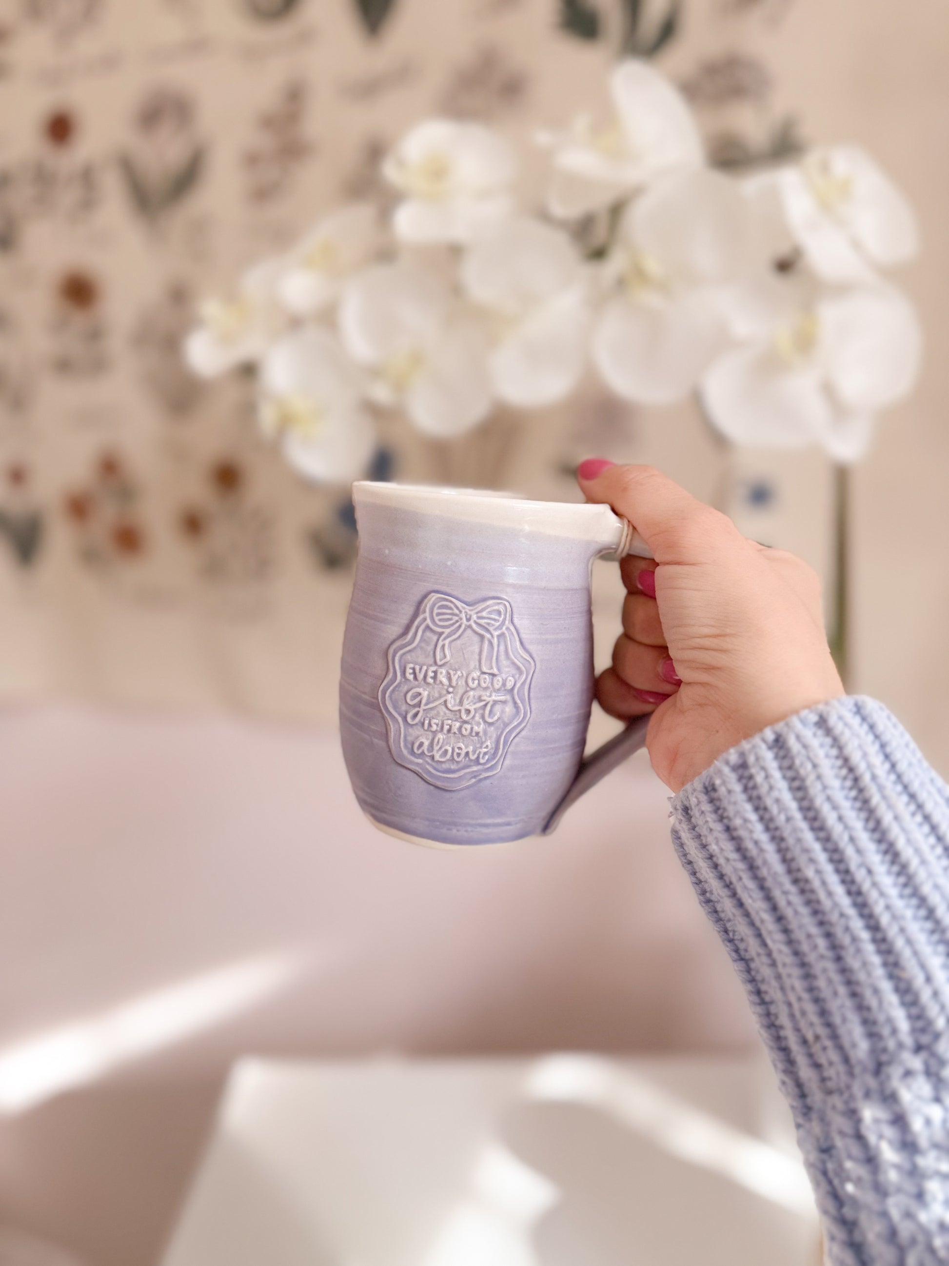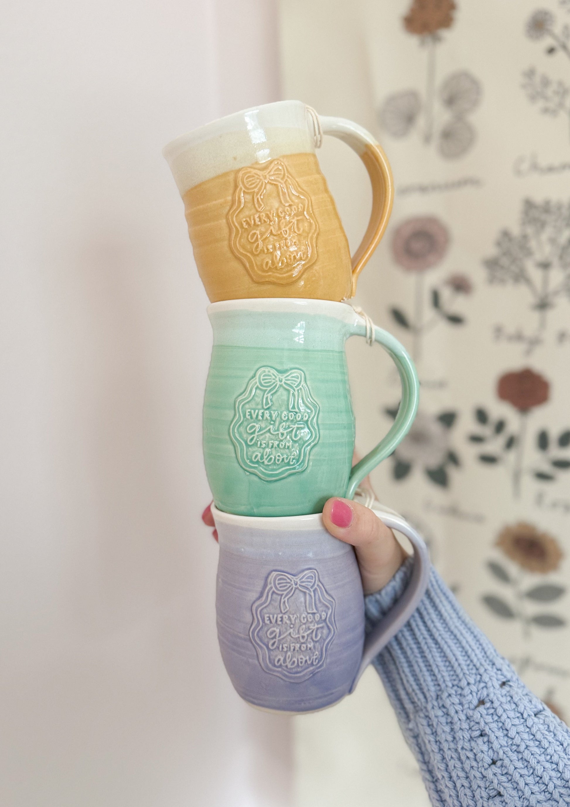 The very definition of a “hug in a mug!” This adorable design reads “every good gift is from above,” based on James 1:17. My prayer is that these words would remind us to look around our home over our morning cup of coffee and notice all of the blessings around us.
