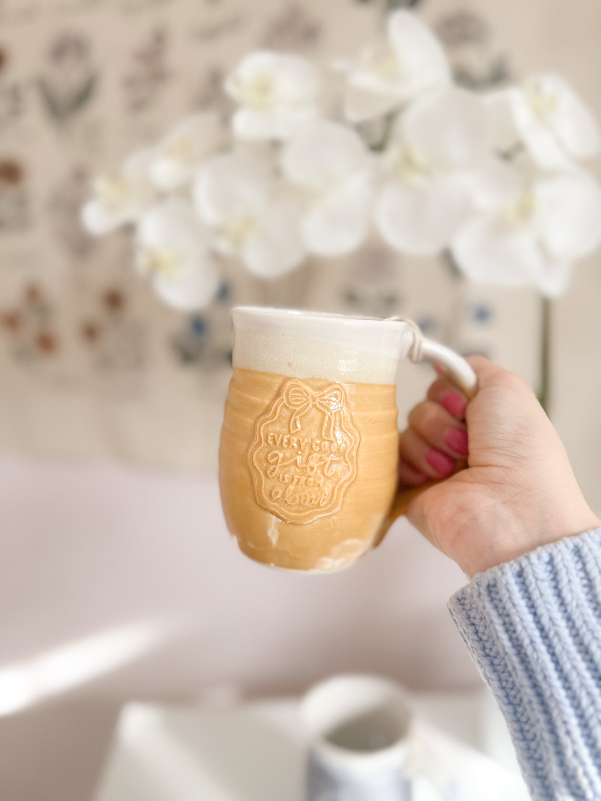 These stunning handmade mugs are hand thrown and finished with a hand carved medallion. They are a true work of art. These are so incredibly special and they are THE MOST COMFY to hold. You will absolutely be grabbing for this mug everyyyy day! This beauty holds roughly 15oz!