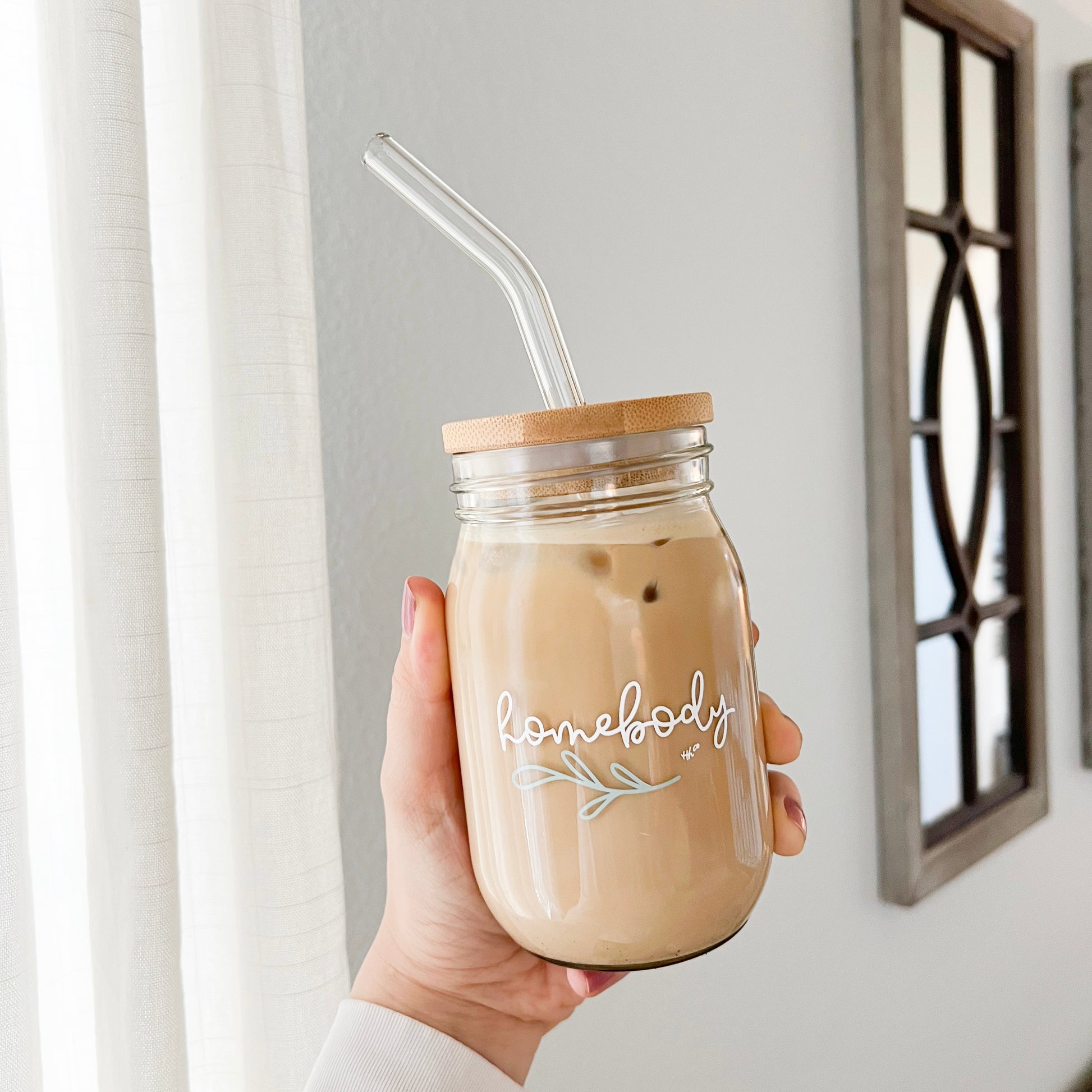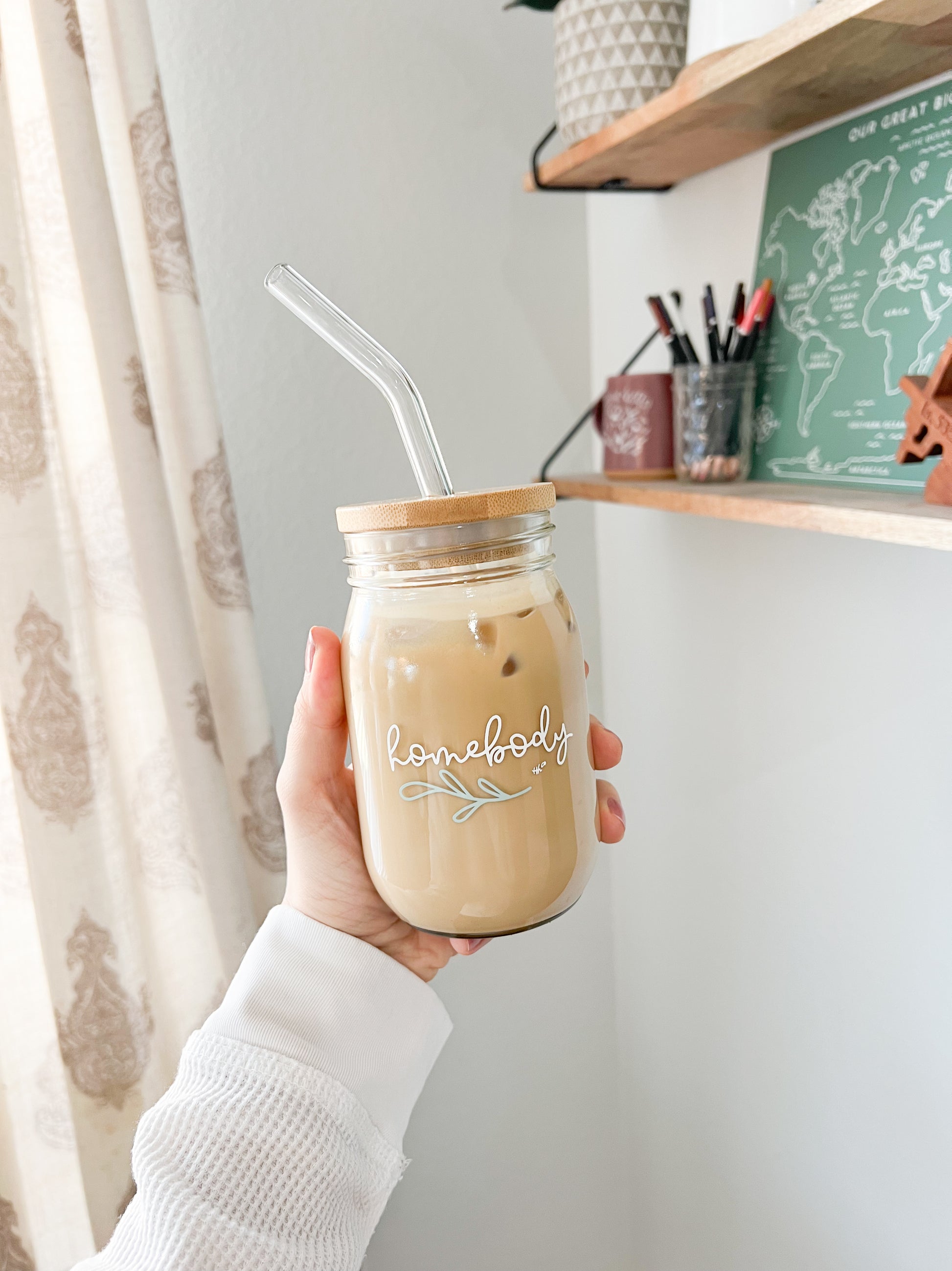 Iced coffee? Tea? Juice? The options are endless in this fun, hand drawn, 16oz mason jar style glass cup! This one is for my fellow homebodies! Those who love to cozy up at home and make their house a haven. I hope you enjoy the "Homebody" glass yourself or gift it to a friend or loved one in your life!