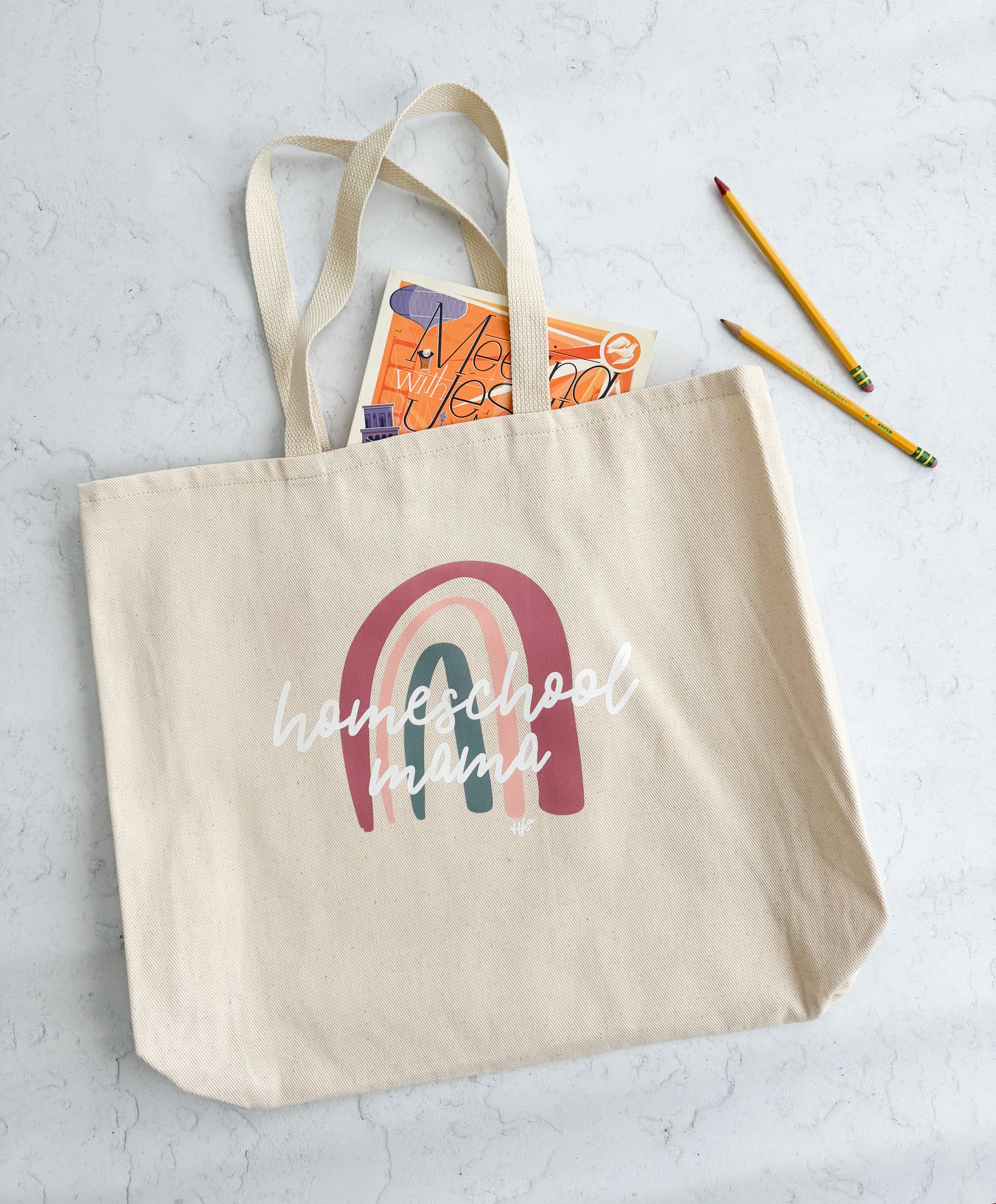 I can’t get enough of this bag!! Our popular “Homeschool Mama” design is now available on these spacious and durable canvas bags!