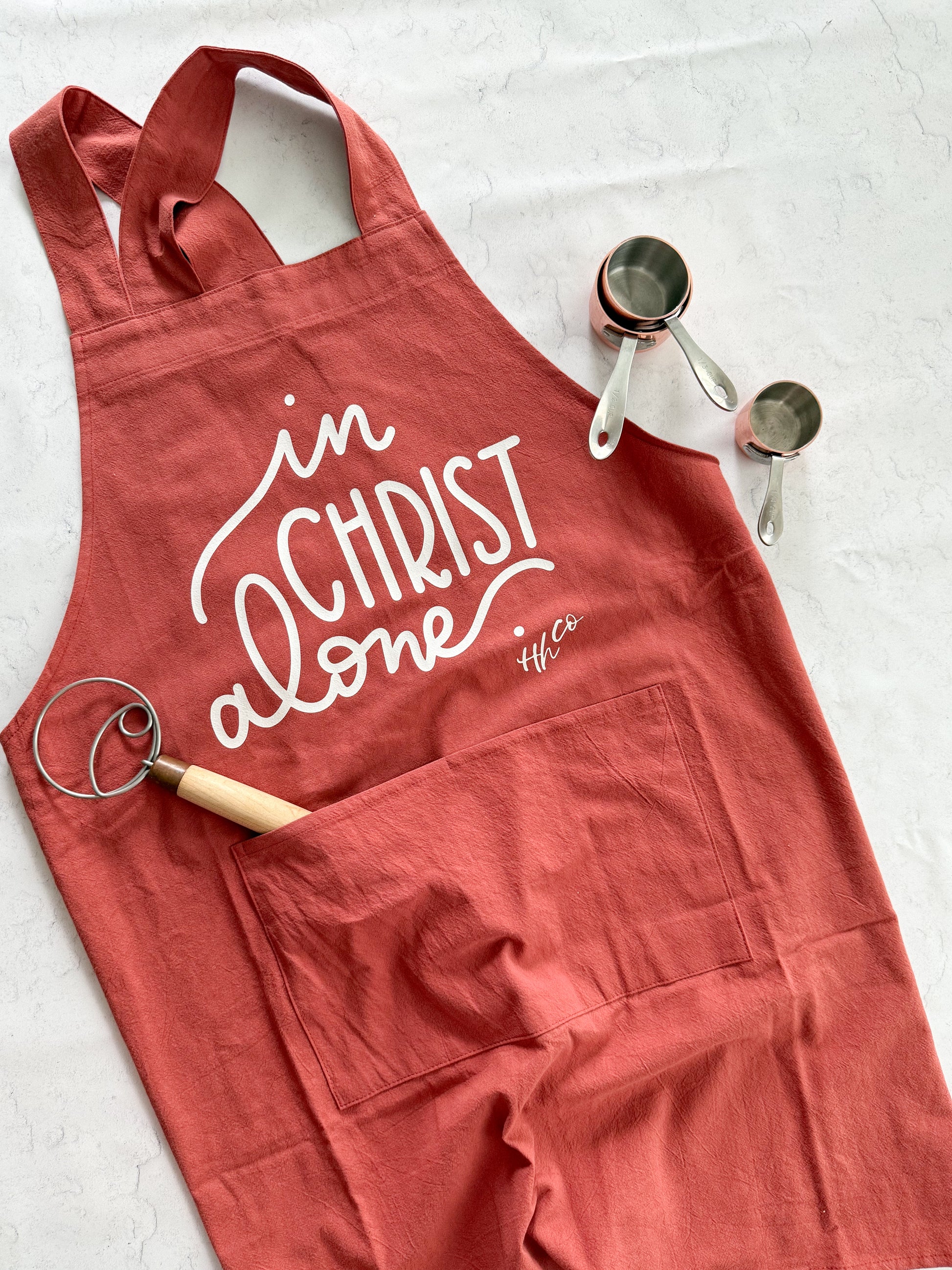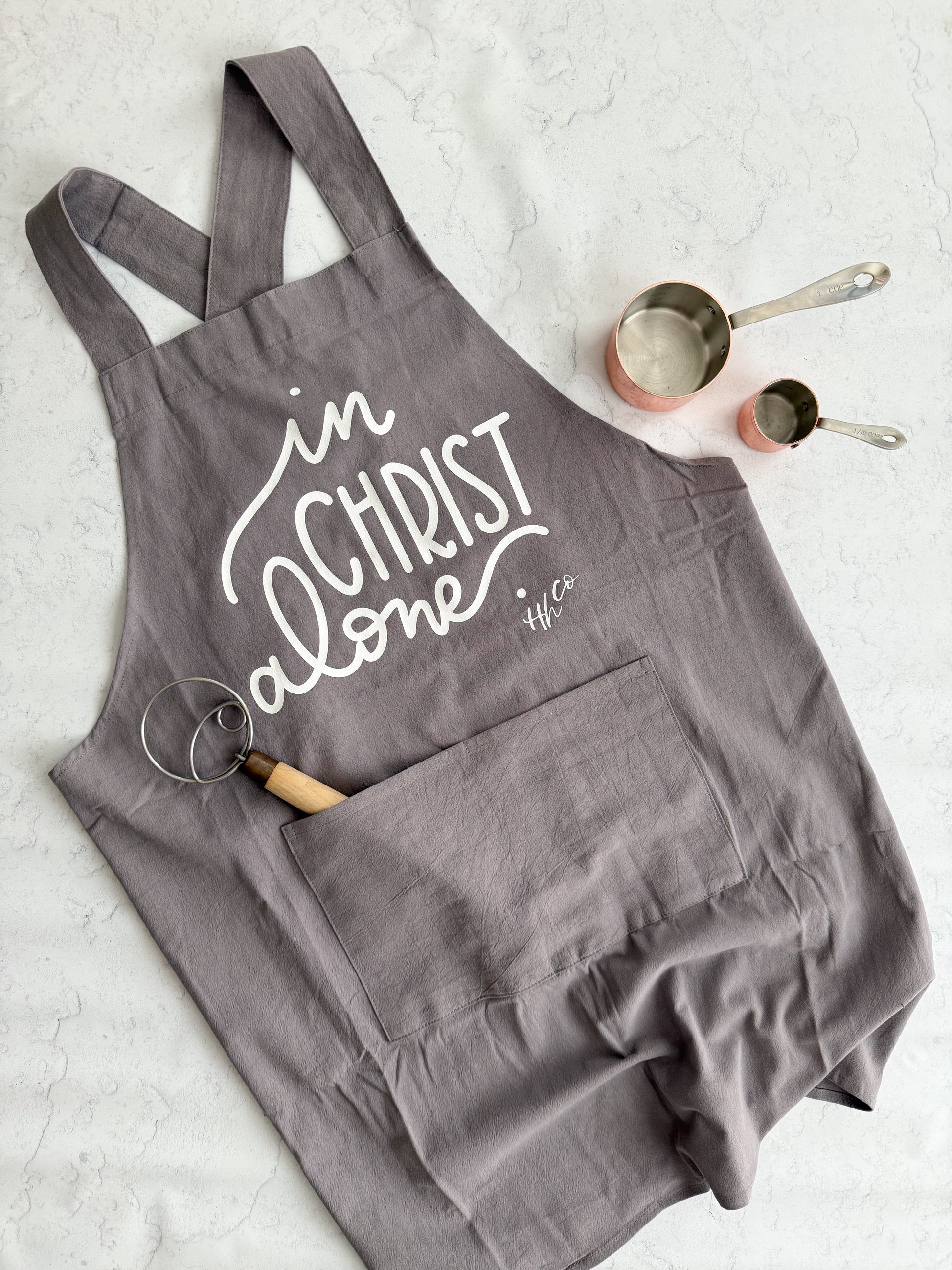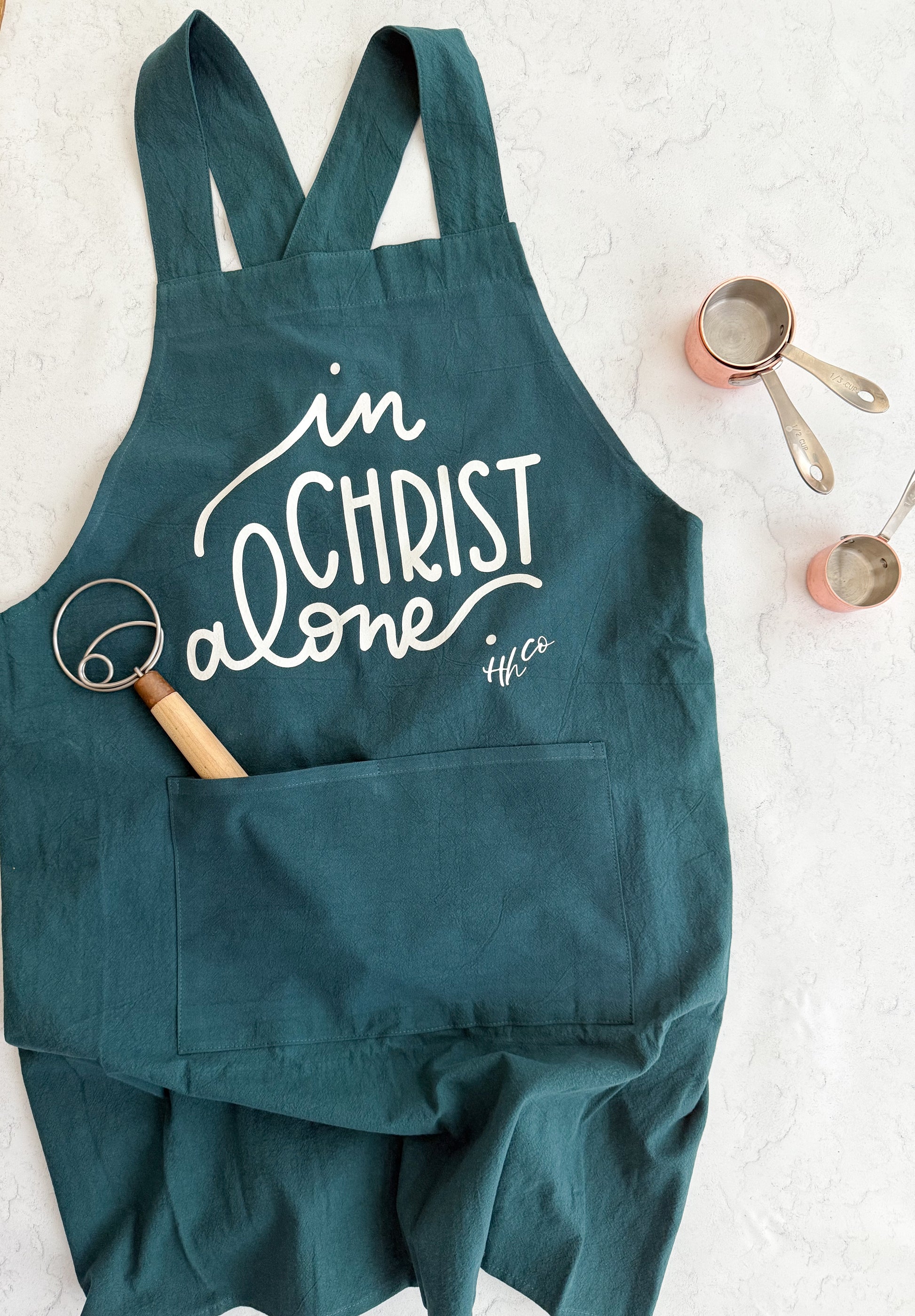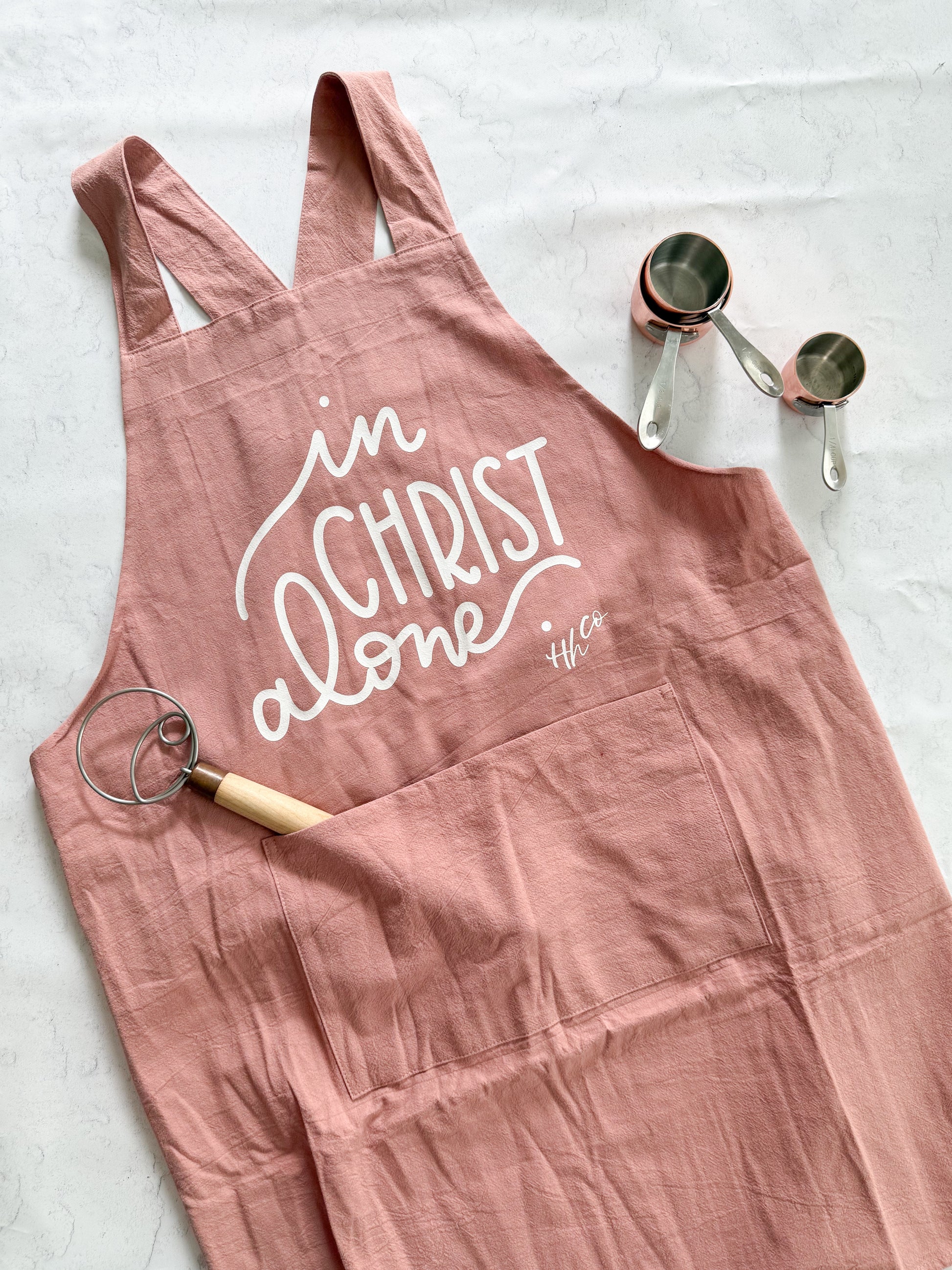 The versatile, light weight, cross back cotton apron is great for cooking, painting, cleaning, and everything in between! The cross back design is easy-on and easy-off, no strings attached. Our “In Christ Alone” design is the perfect reminder as you go about your daily tasks at home!