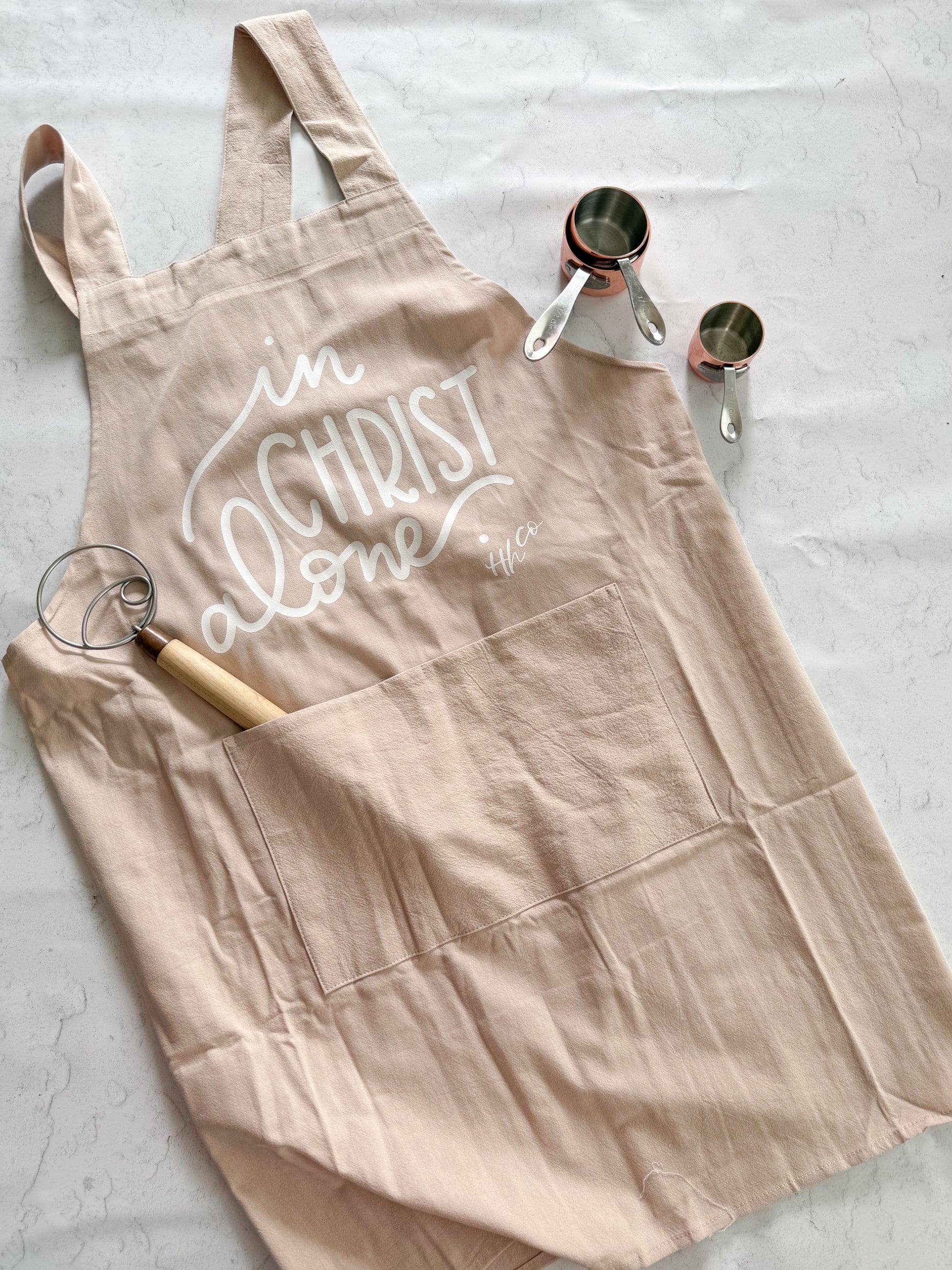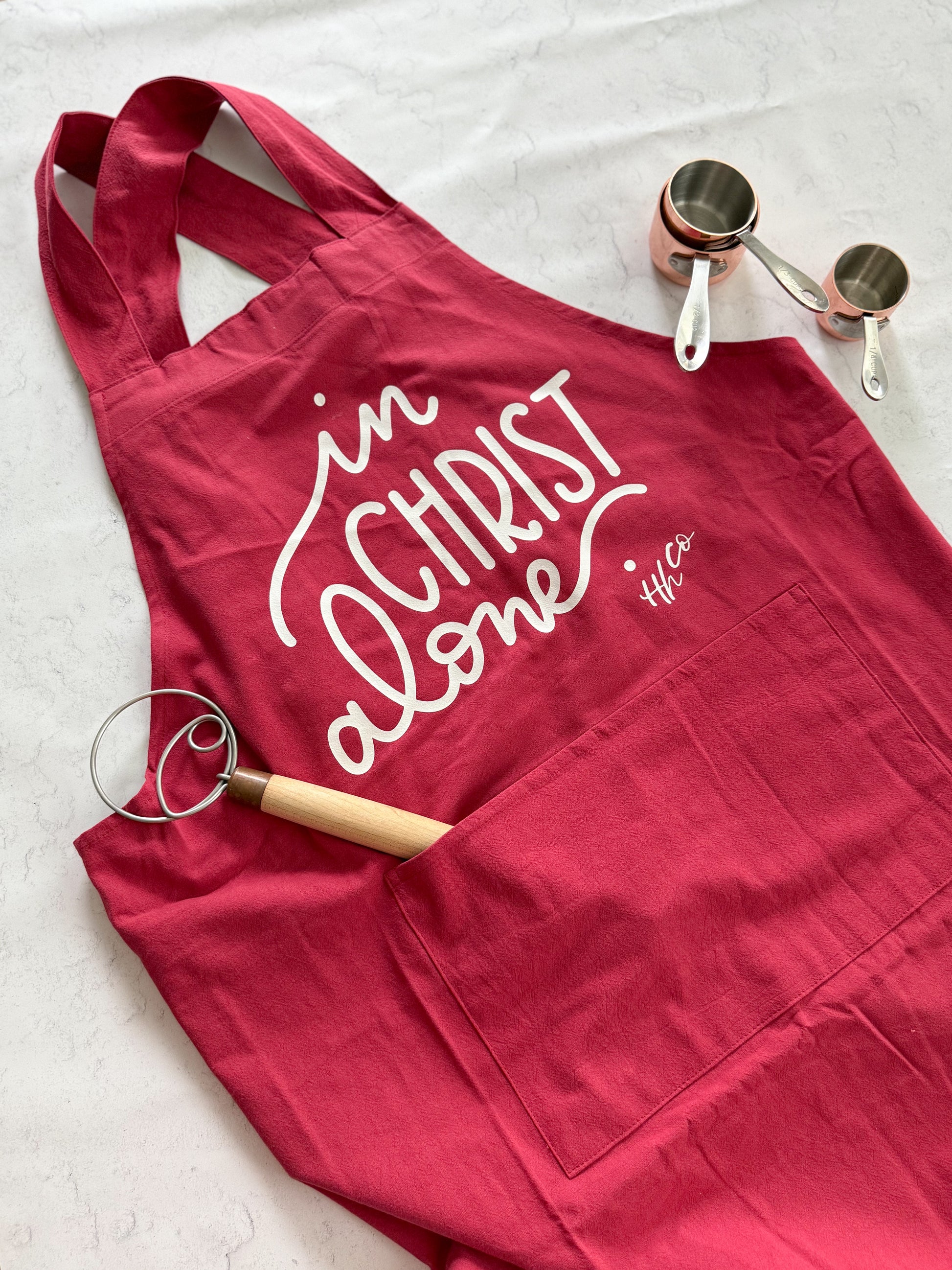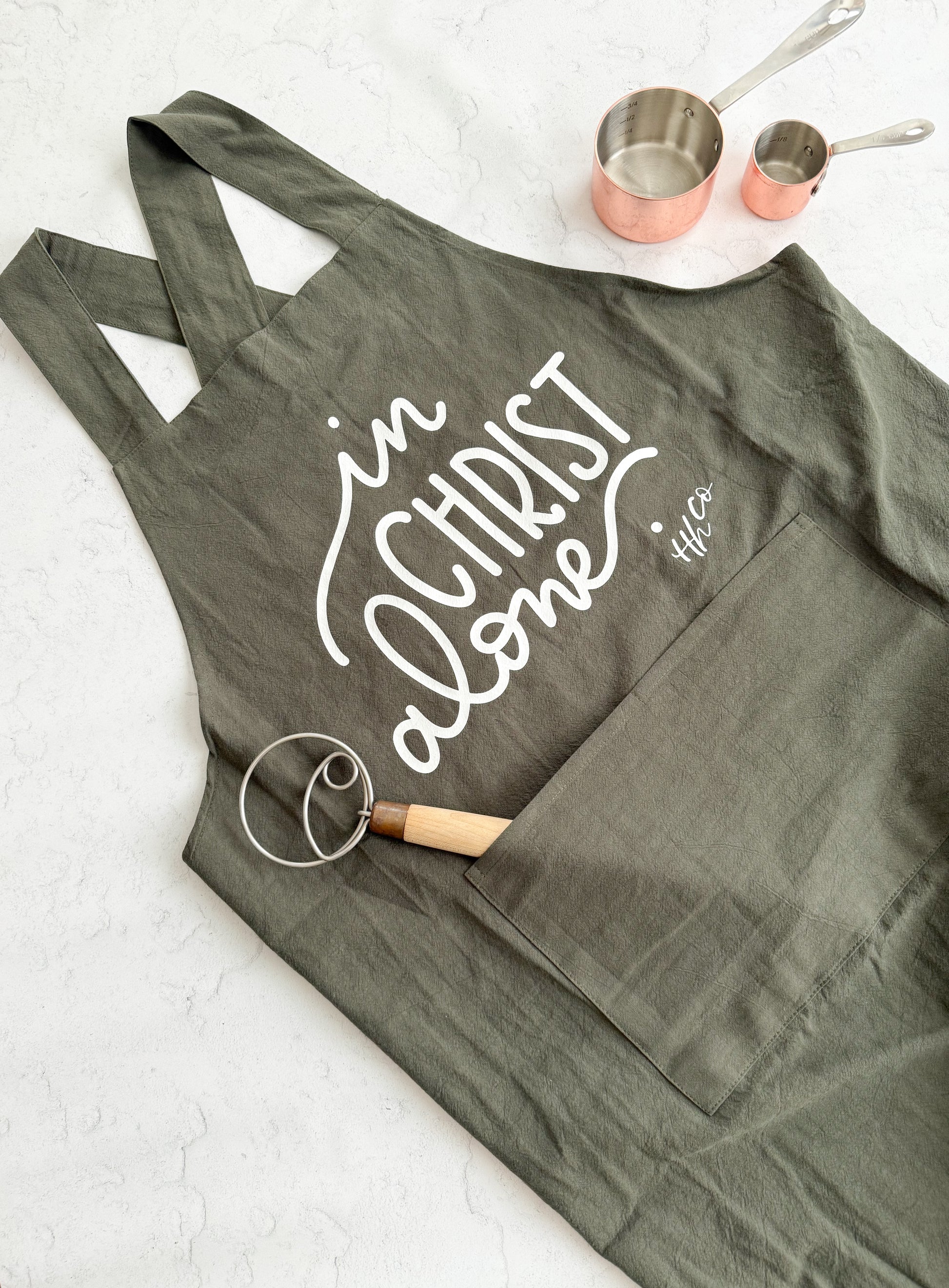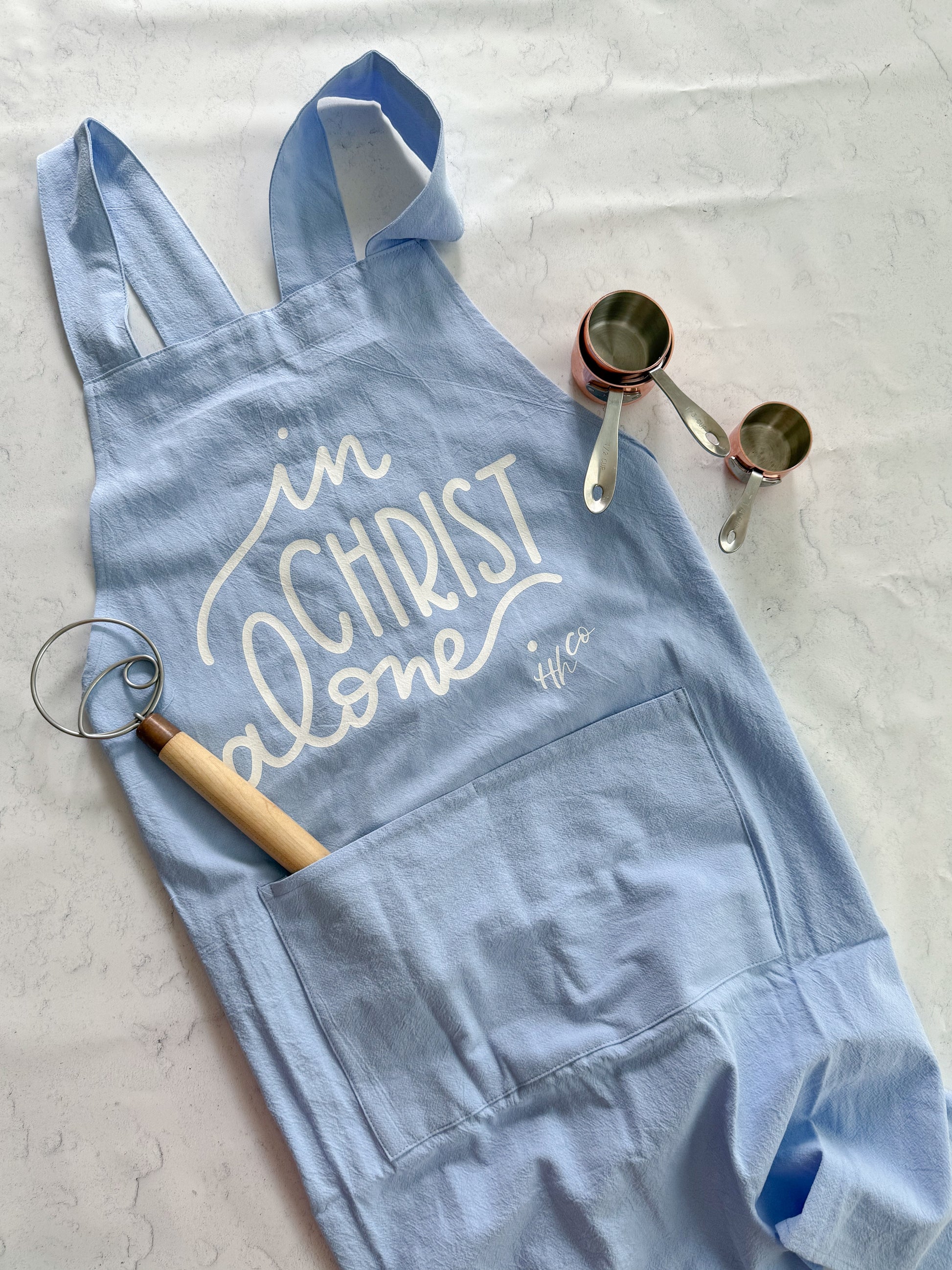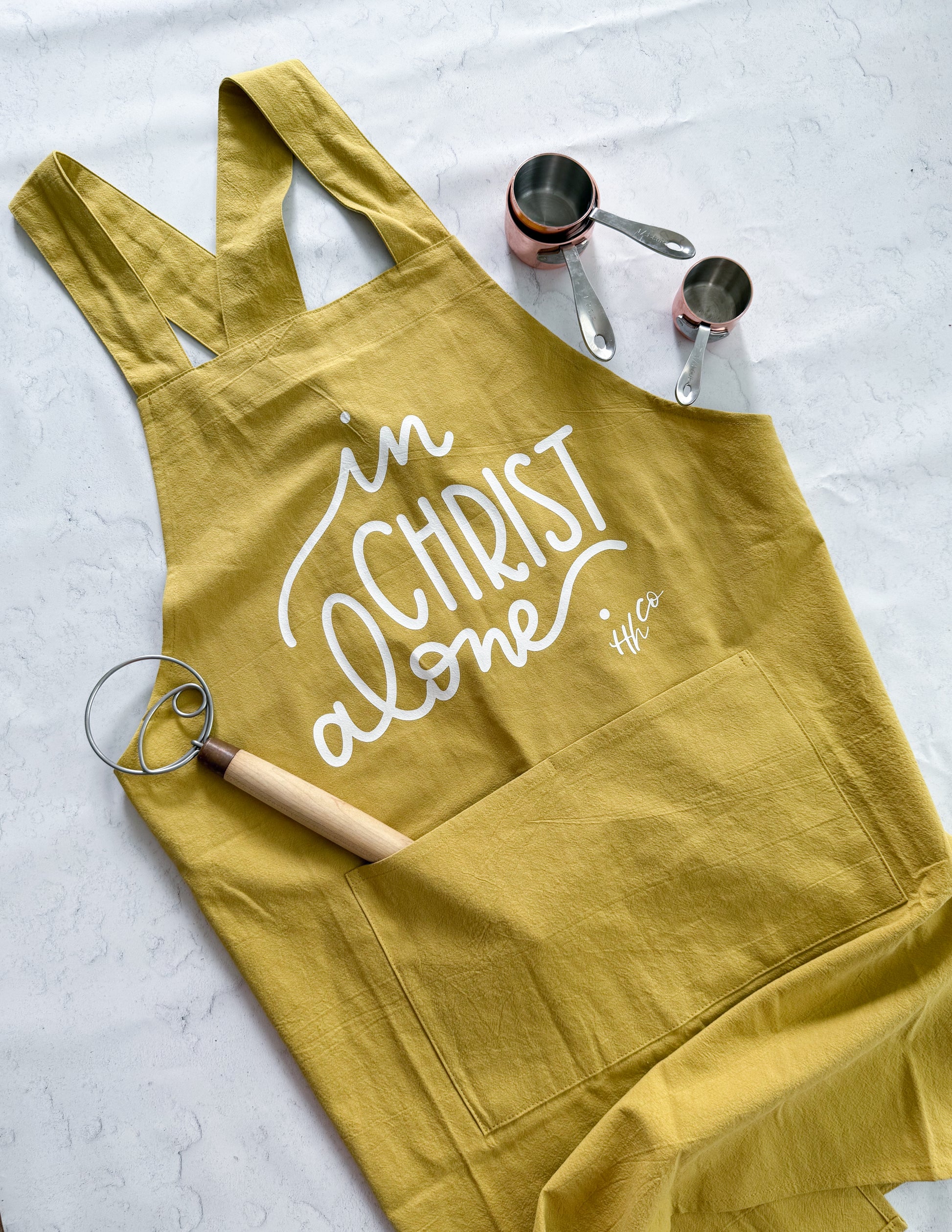 The versatile, light weight, cross back cotton apron is great for cooking, painting, cleaning, and everything in between! The cross back design is easy-on and easy-off, no strings attached. Our “In Christ Alone” design is the perfect reminder as you go about your daily tasks at home!