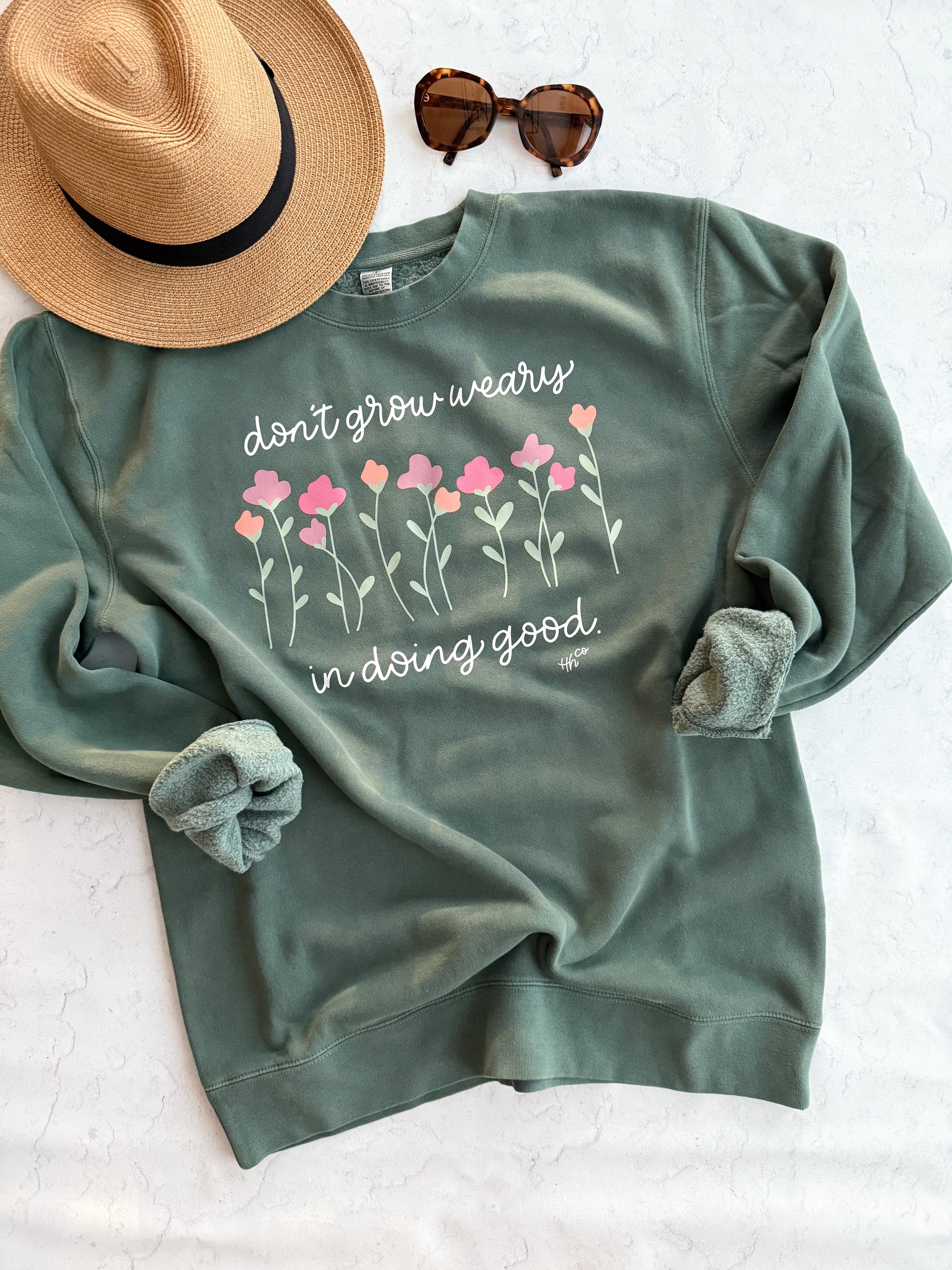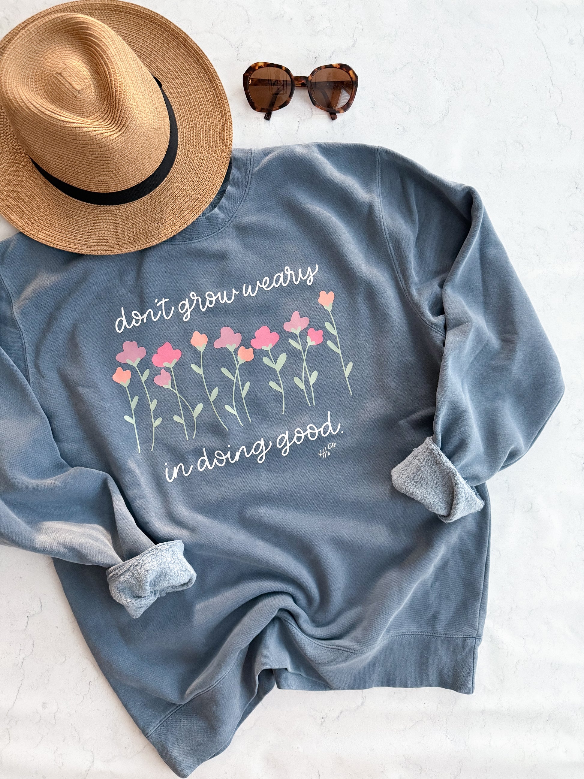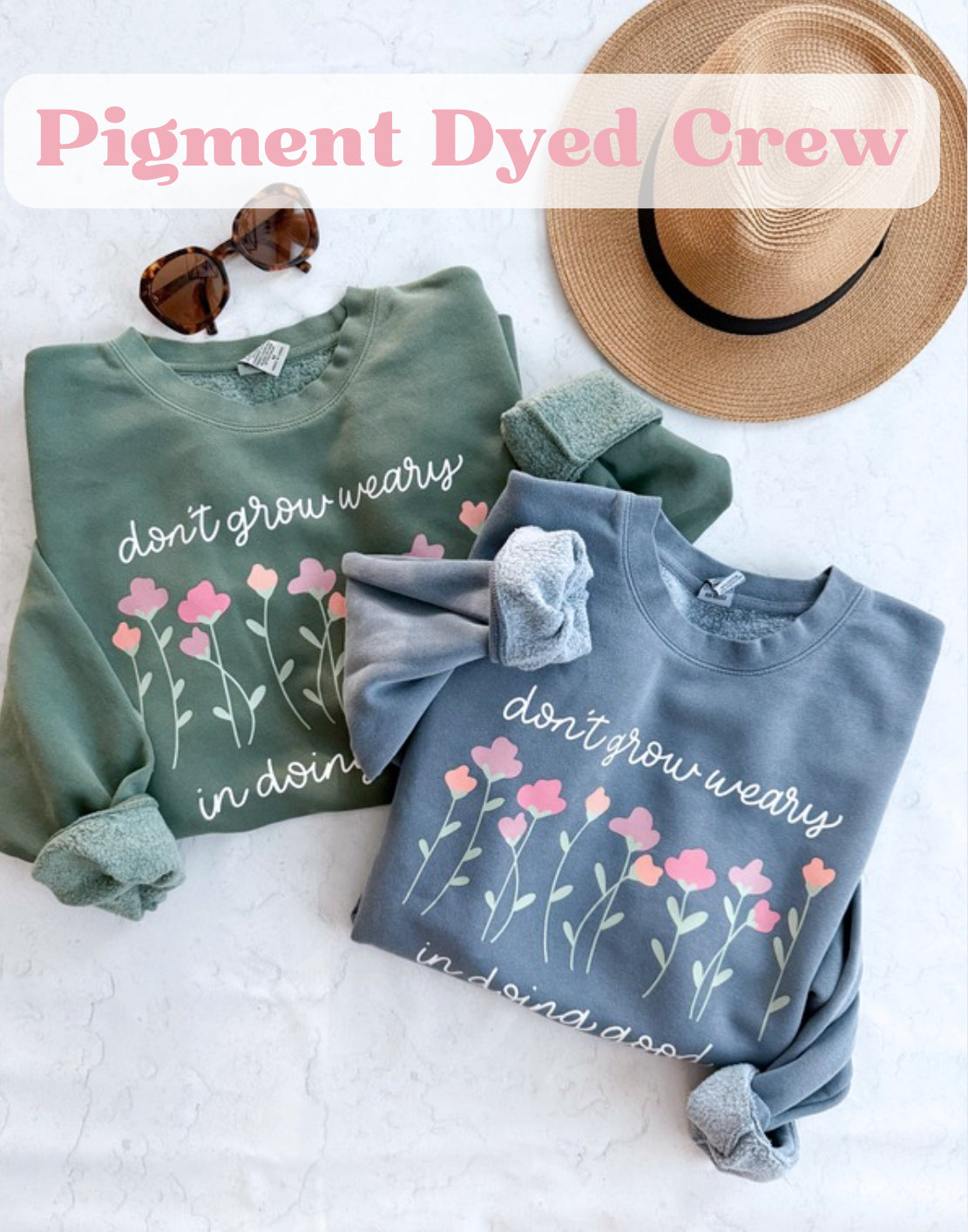 This design is DTF transferred right here in Texas onto these gorgeous pigment dyed crewneck sweatshirts.
