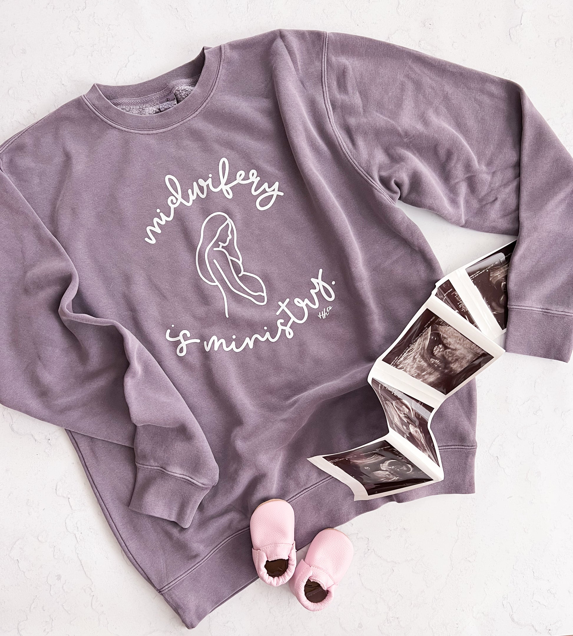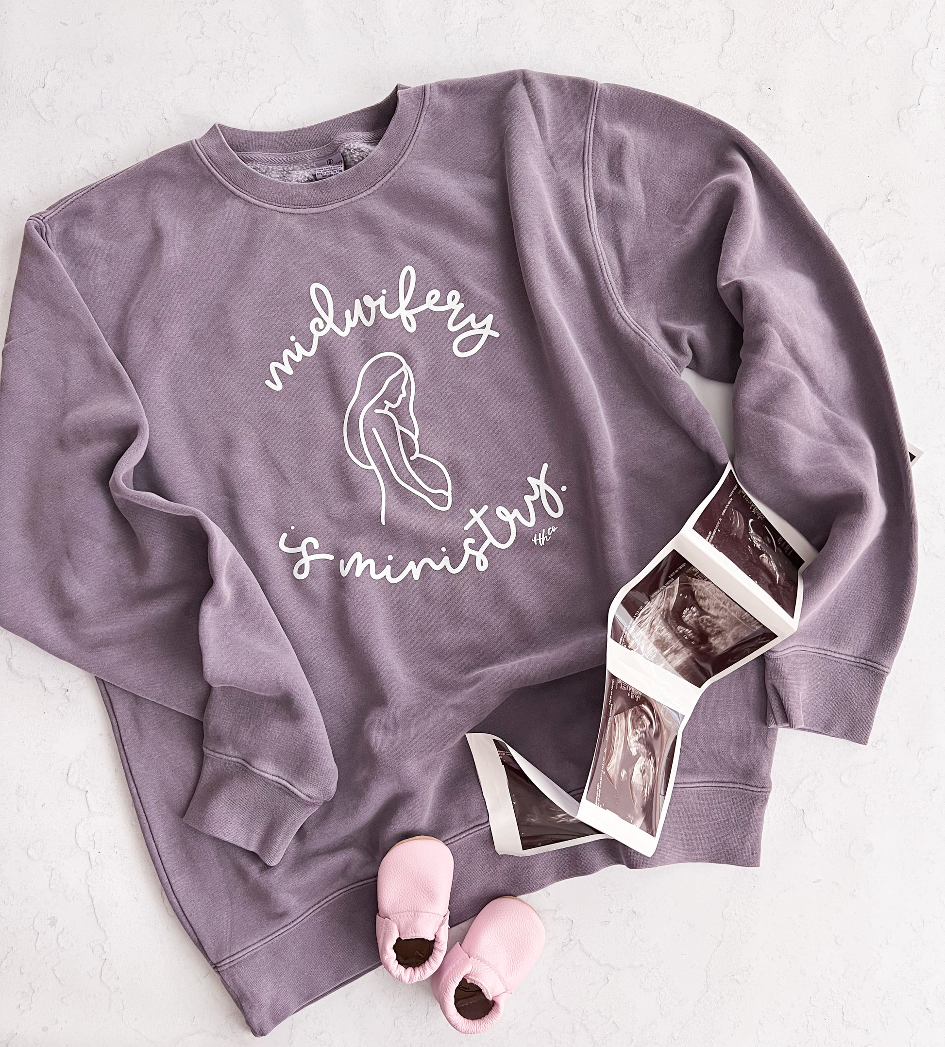 This one’s for the midwives! These stunning sweatshirts are screen printed with our brand new “midwifery is ministry” design! We are so thankful for the skilled hands of midwives who support mothers during their pregnancies and assist us in birth!