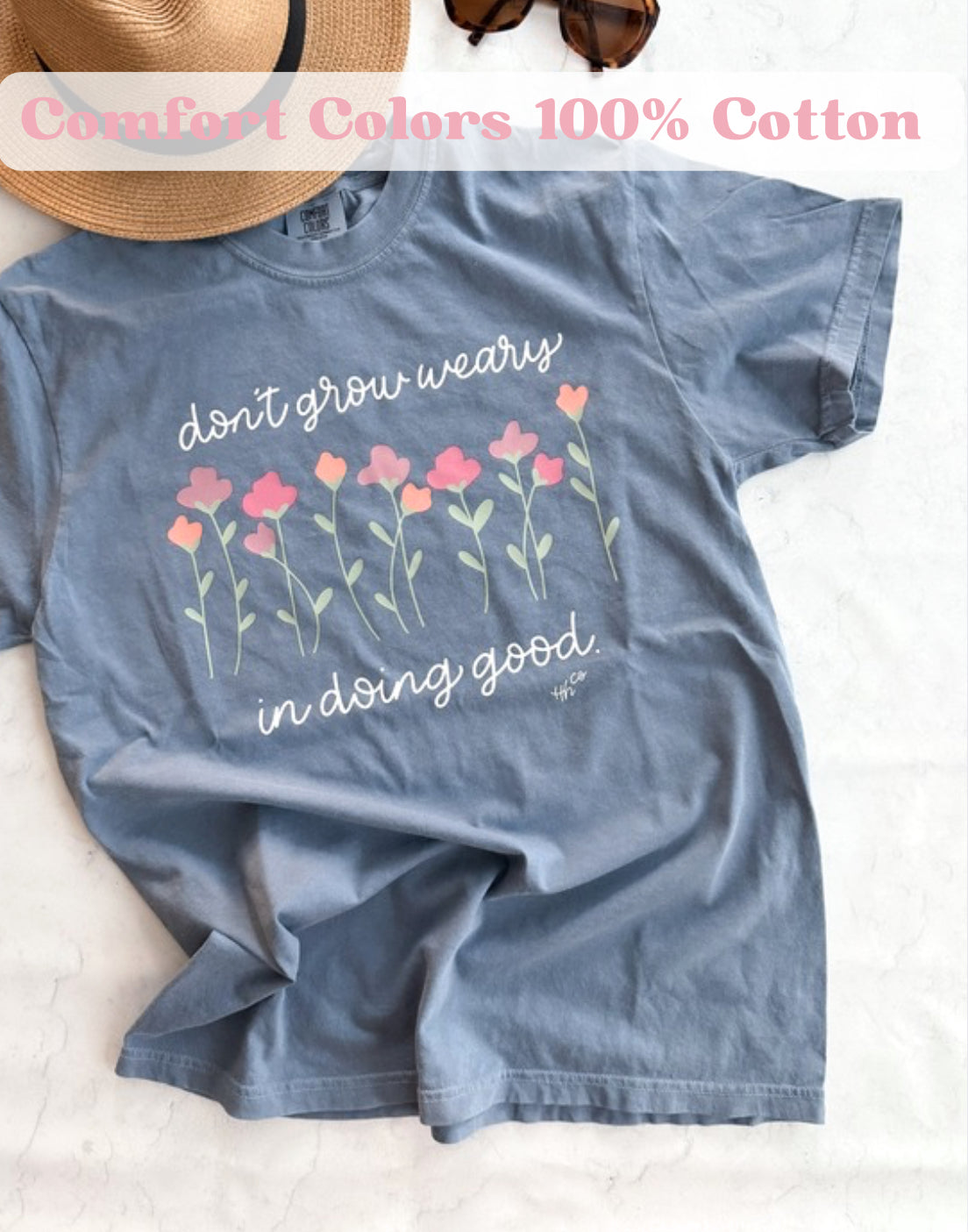 Our “don’t grow weary” design is DTF transferred right here in Texas onto this gorgeous blue 100% cotton tee.
