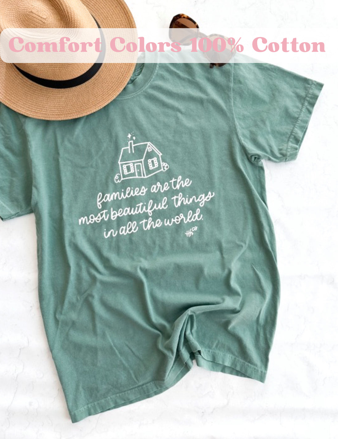 Our “family” design is screen print transferred right here in Texas onto this gorgeous green 100% cotton tee.