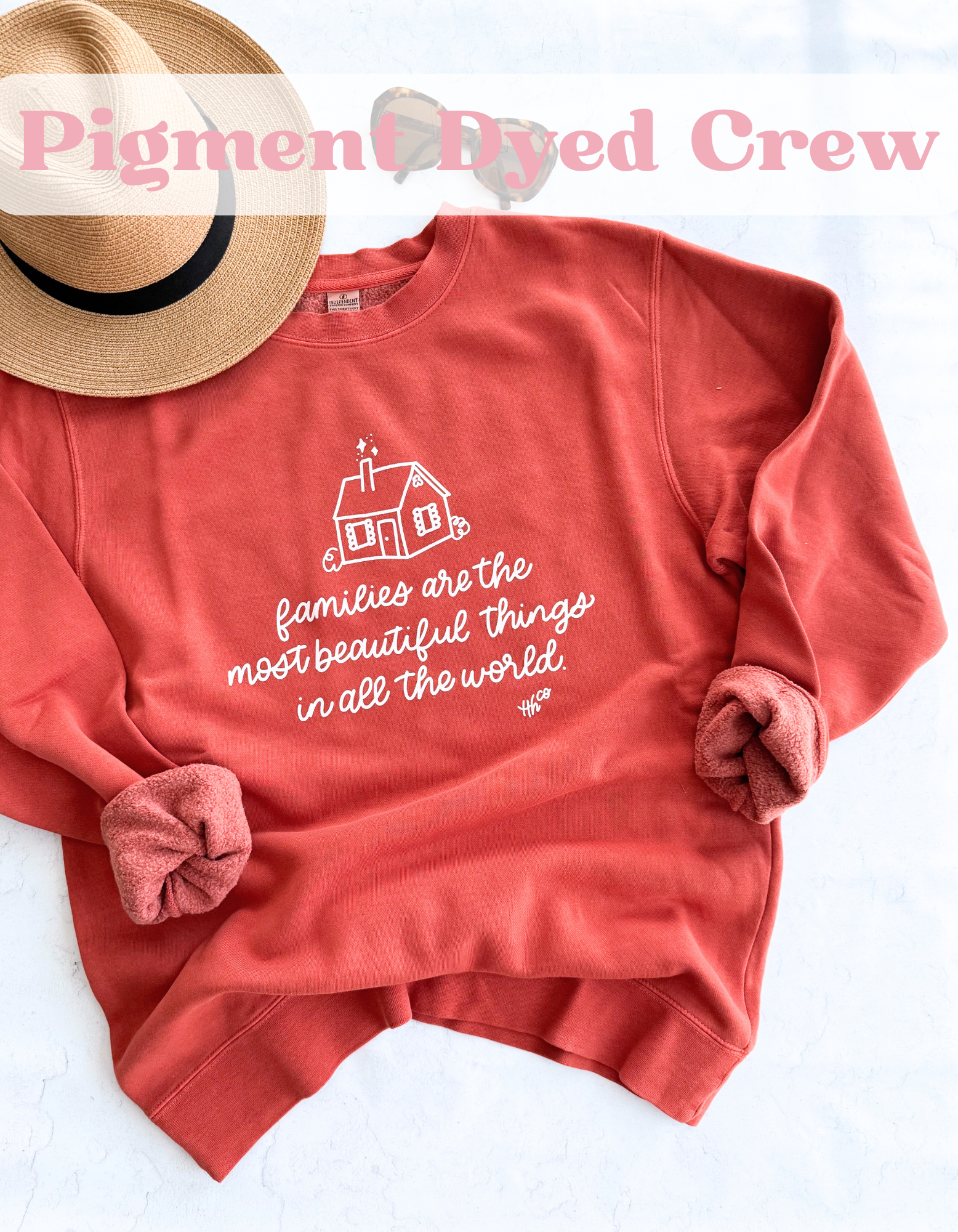 Our “Family” design is screen print transferred right here in Texas onto this gorgeous amber pigment dyed crewneck sweatshirt.