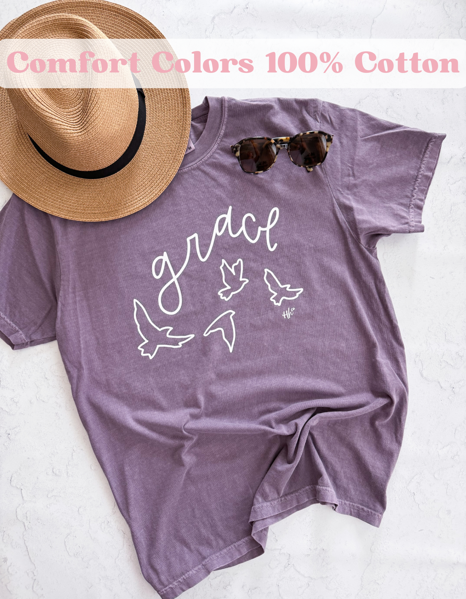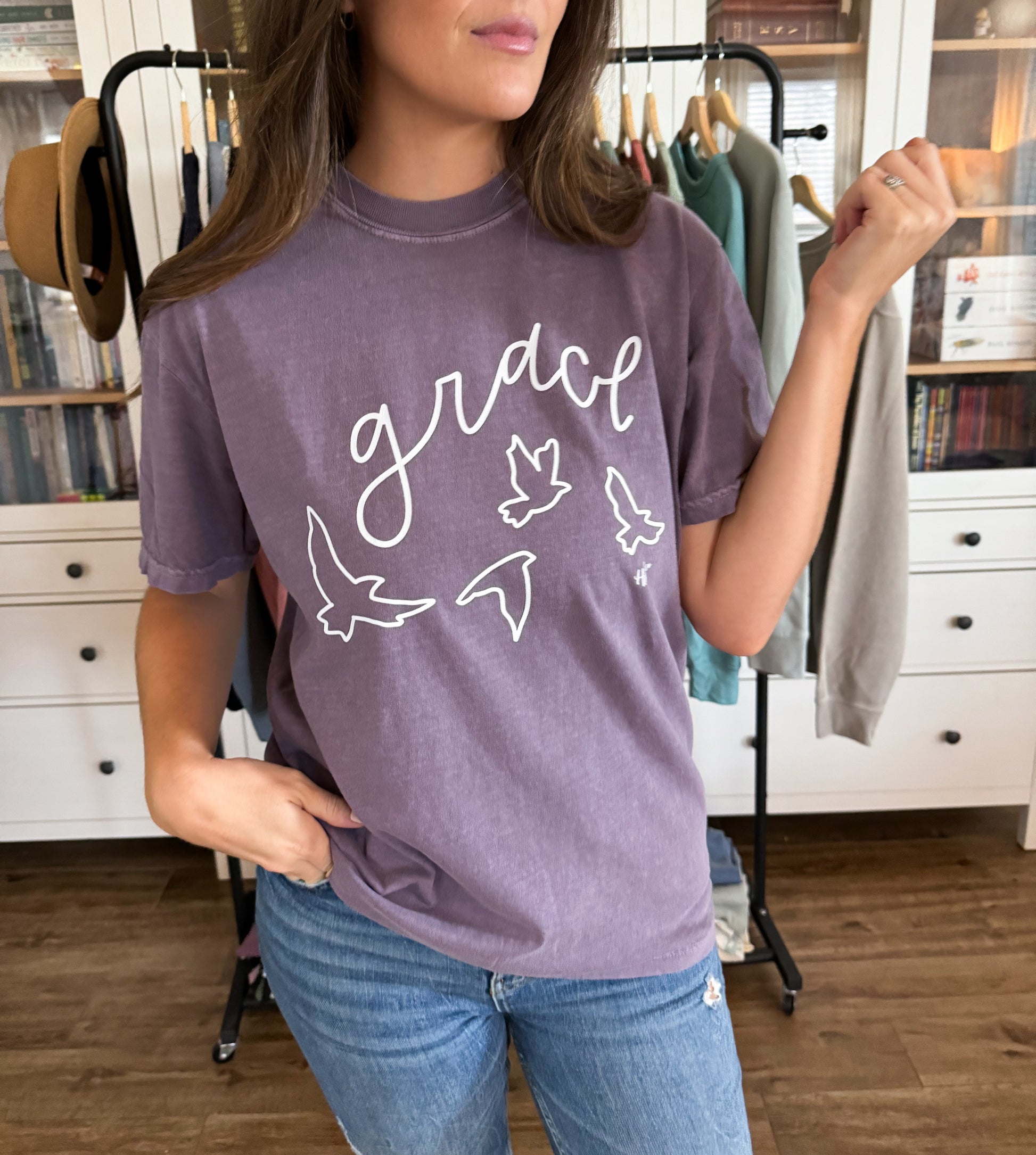 We ADORE this one! Our “grace” design is screen print transferred right here in Texas! This 100% cotton tee fits true to size and comes in the color plum! I pray this simple yet beautiful design reminds you of the grace of God that goes with you each and every day!
