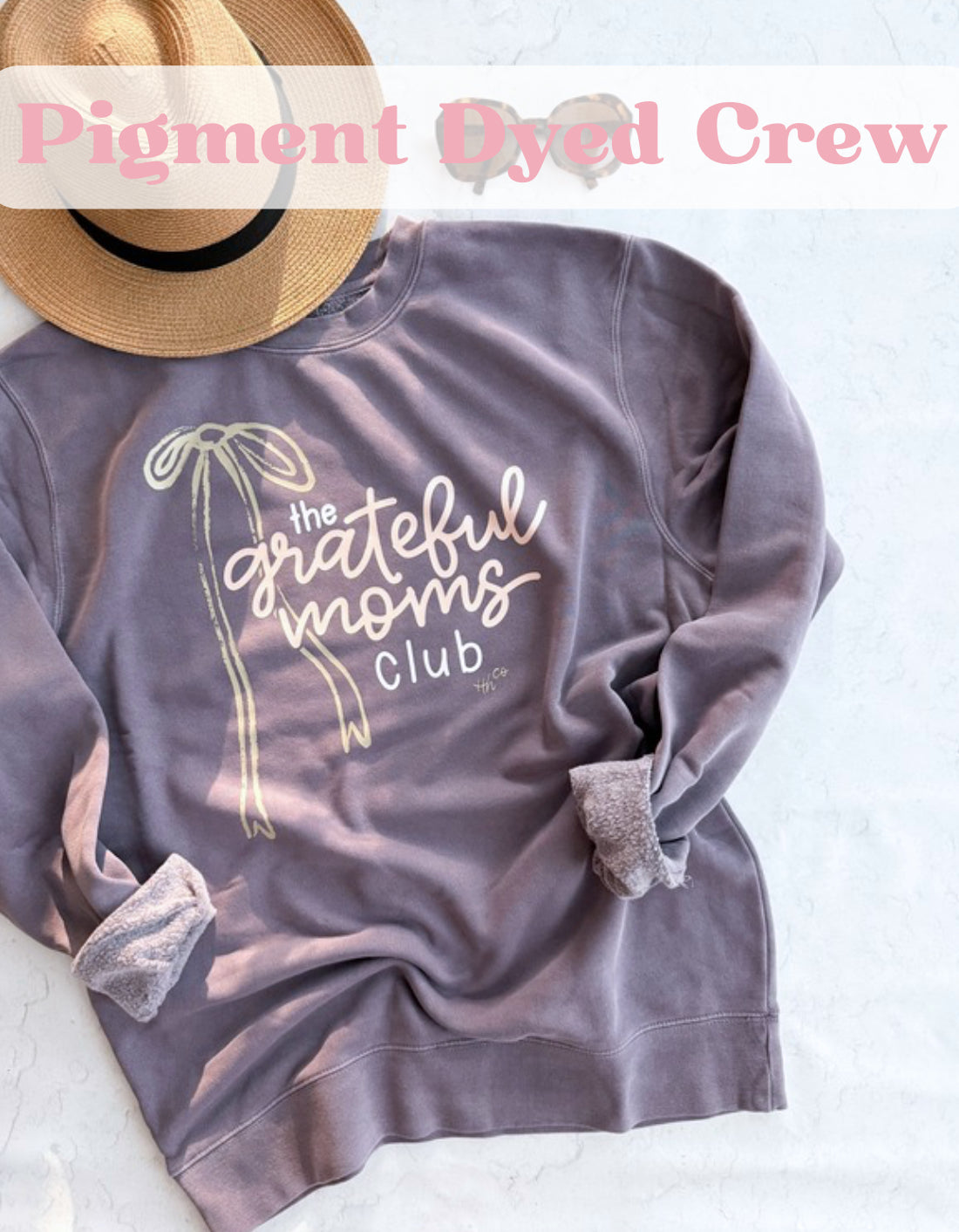 This design is DTF transferred right here in Texas onto these gorgeous plum pigment dyed crewneck.