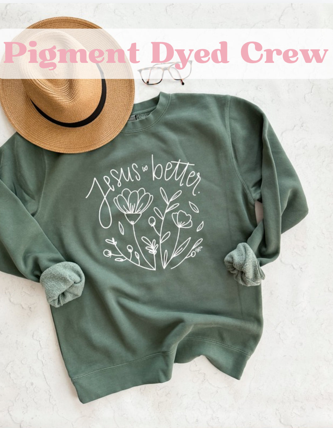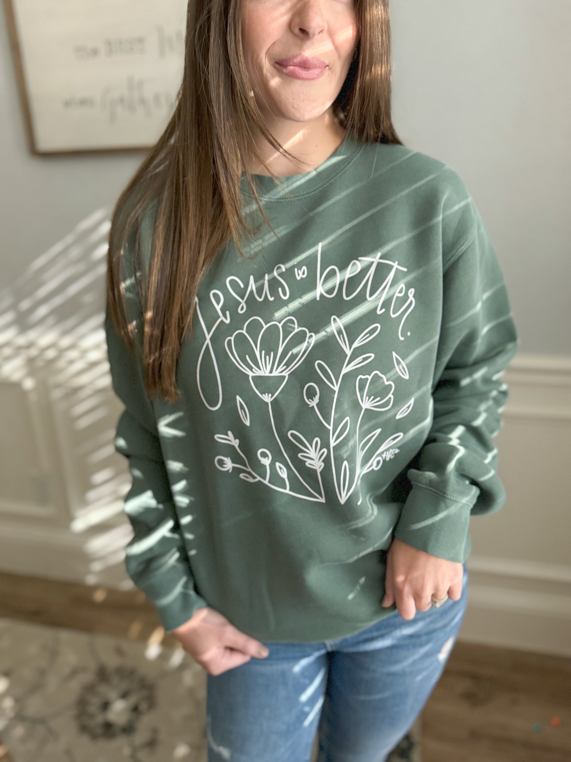 Our “Jesus is better” design is screen print transferred right here in Texas onto this gorgeous alpine green pigment dyed crewneck sweatshirt.