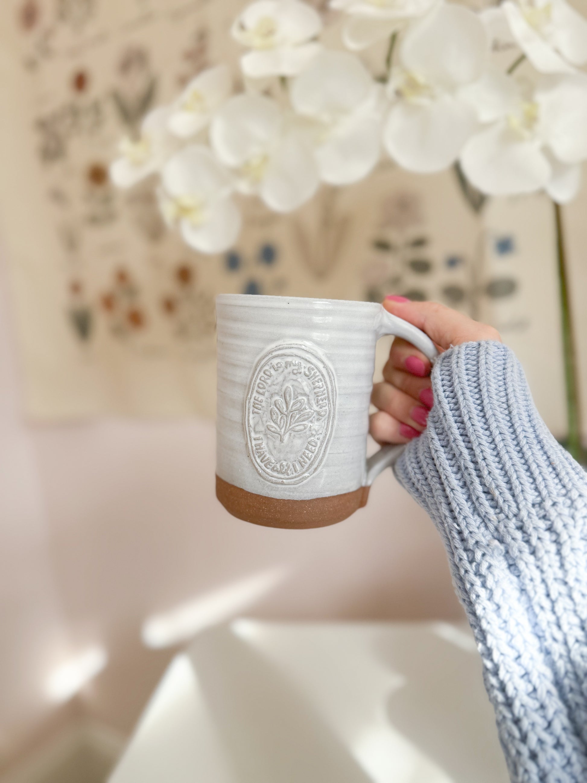 These stunning handmade mugs are hand thrown and finished with a hand carved medallion. They are a true work of art. These are so incredibly special and they are THE MOST COMFY to hold. You will absolutely be grabbing for this mug everyyyy day! This beauty holds roughly 15oz!