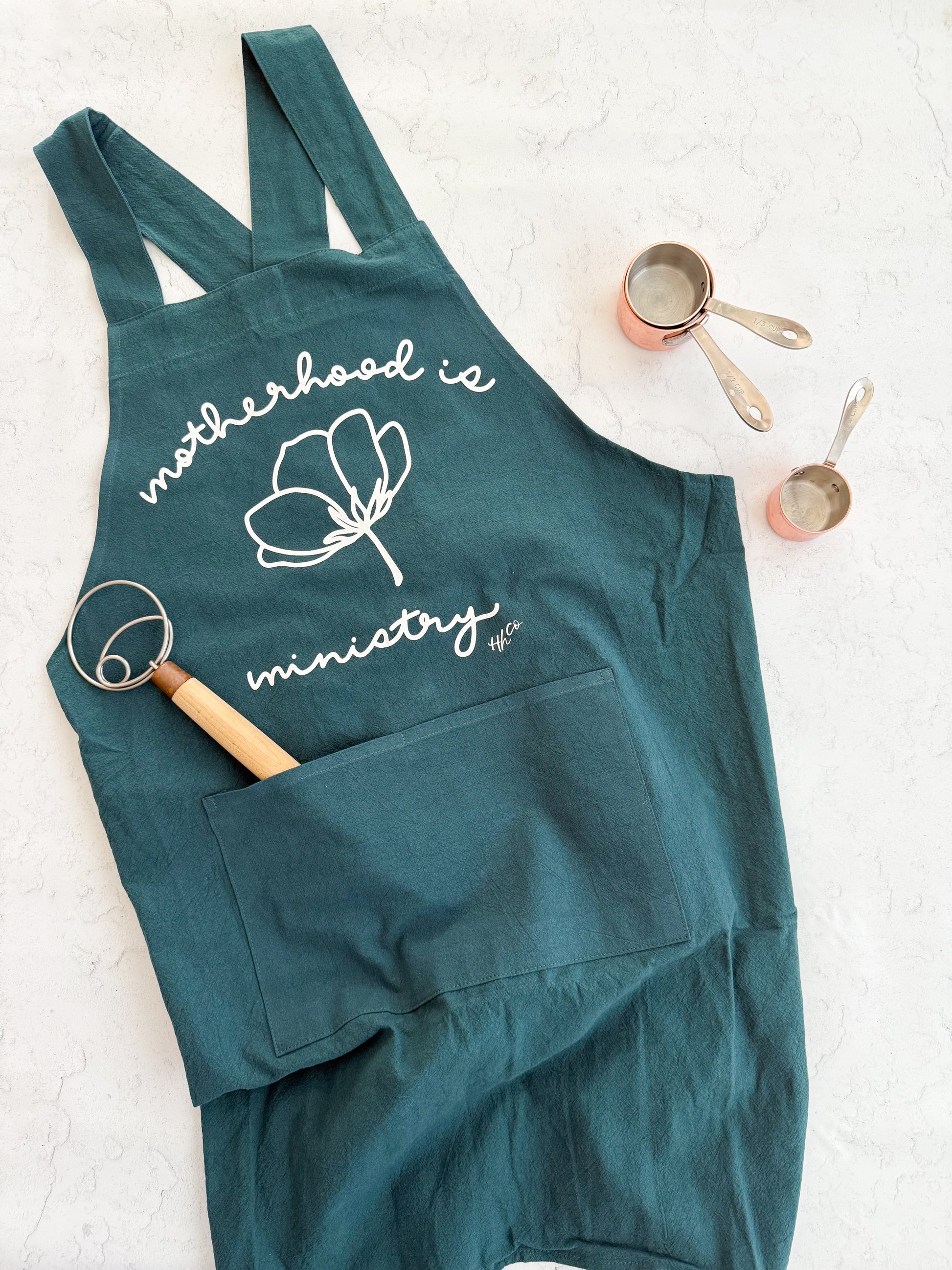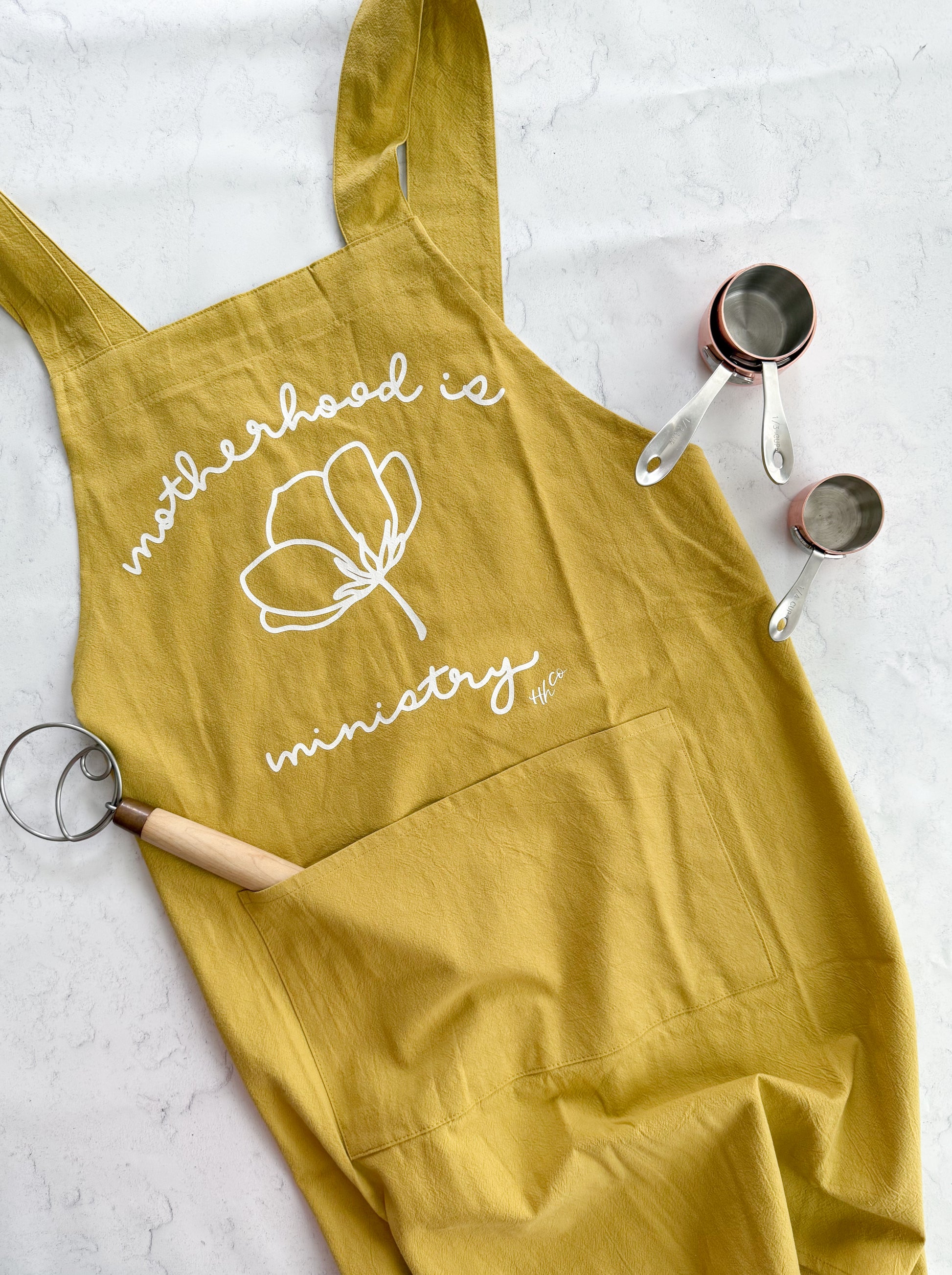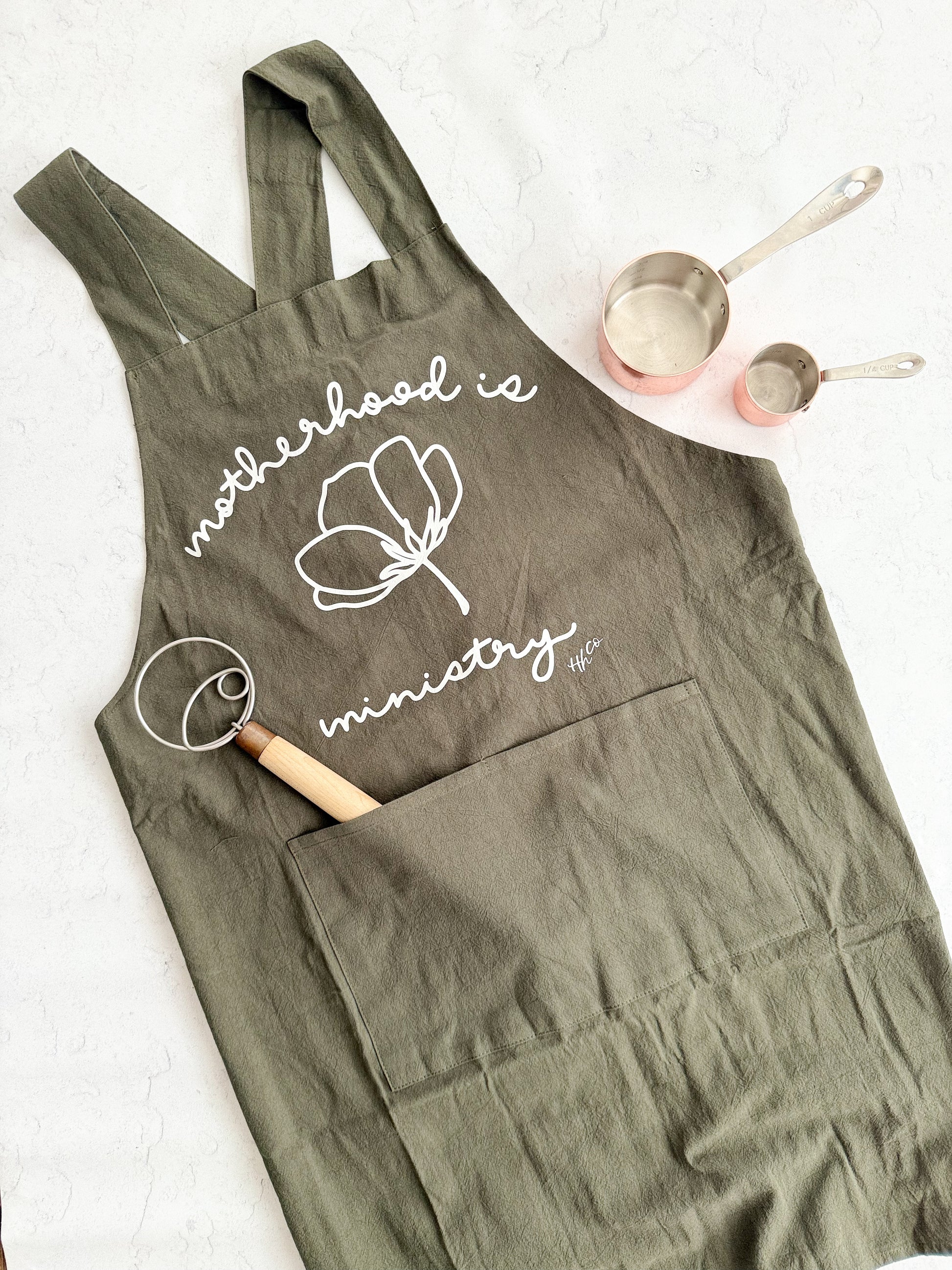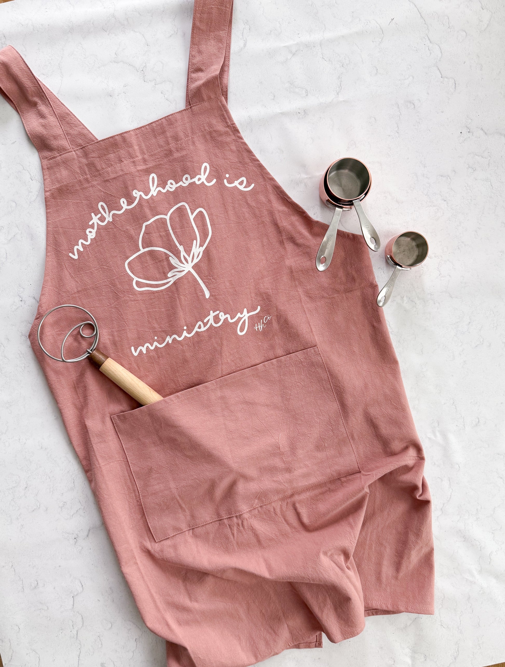 The versatile, light weight, cross back cotton apron is great for cooking, painting, cleaning, and everything in between! The cross back design is easy-on and easy-off, no strings attached. Our “Motherhood is Ministry” design is the perfect reminder as you go about your daily tasks at home!
