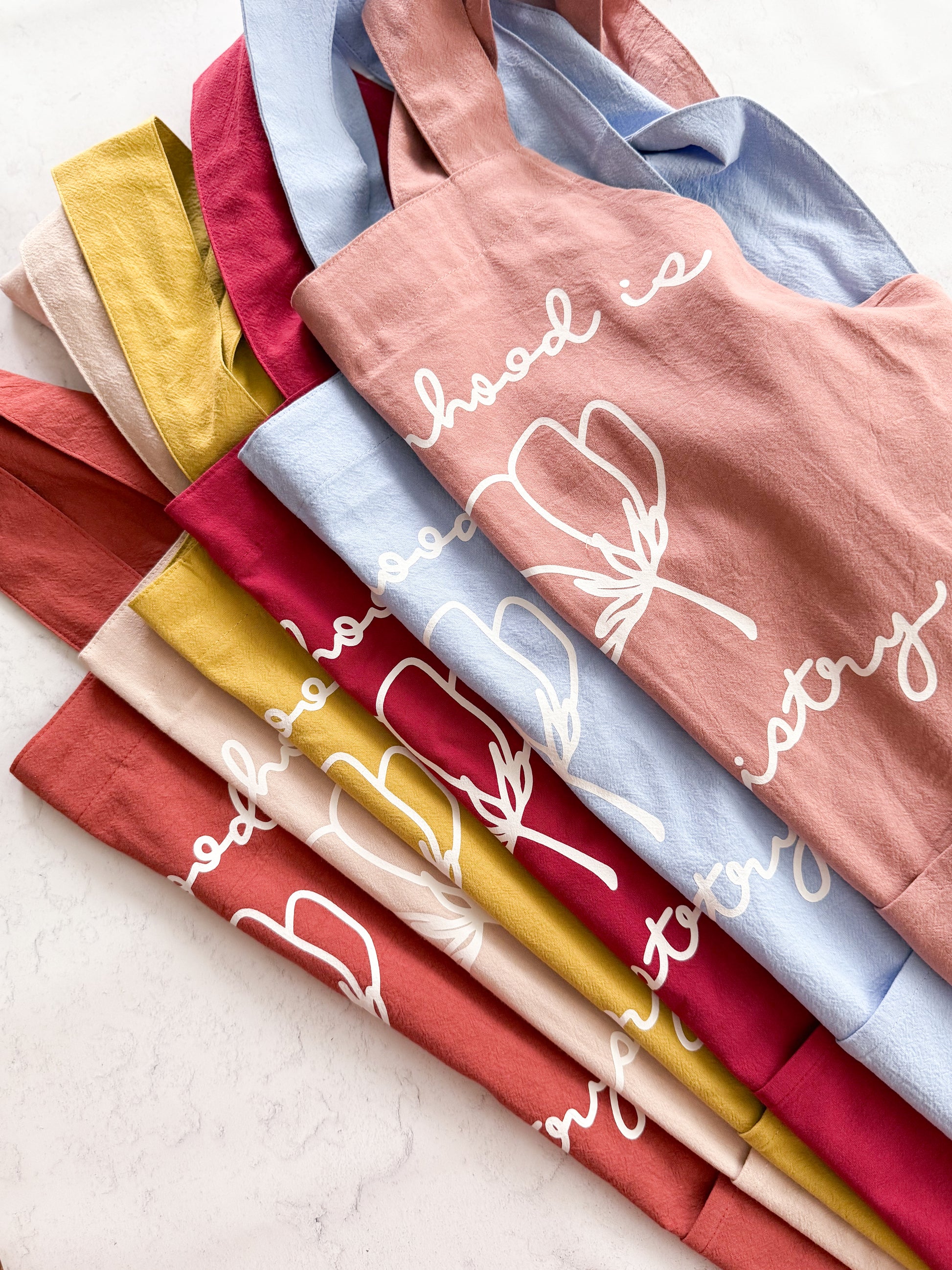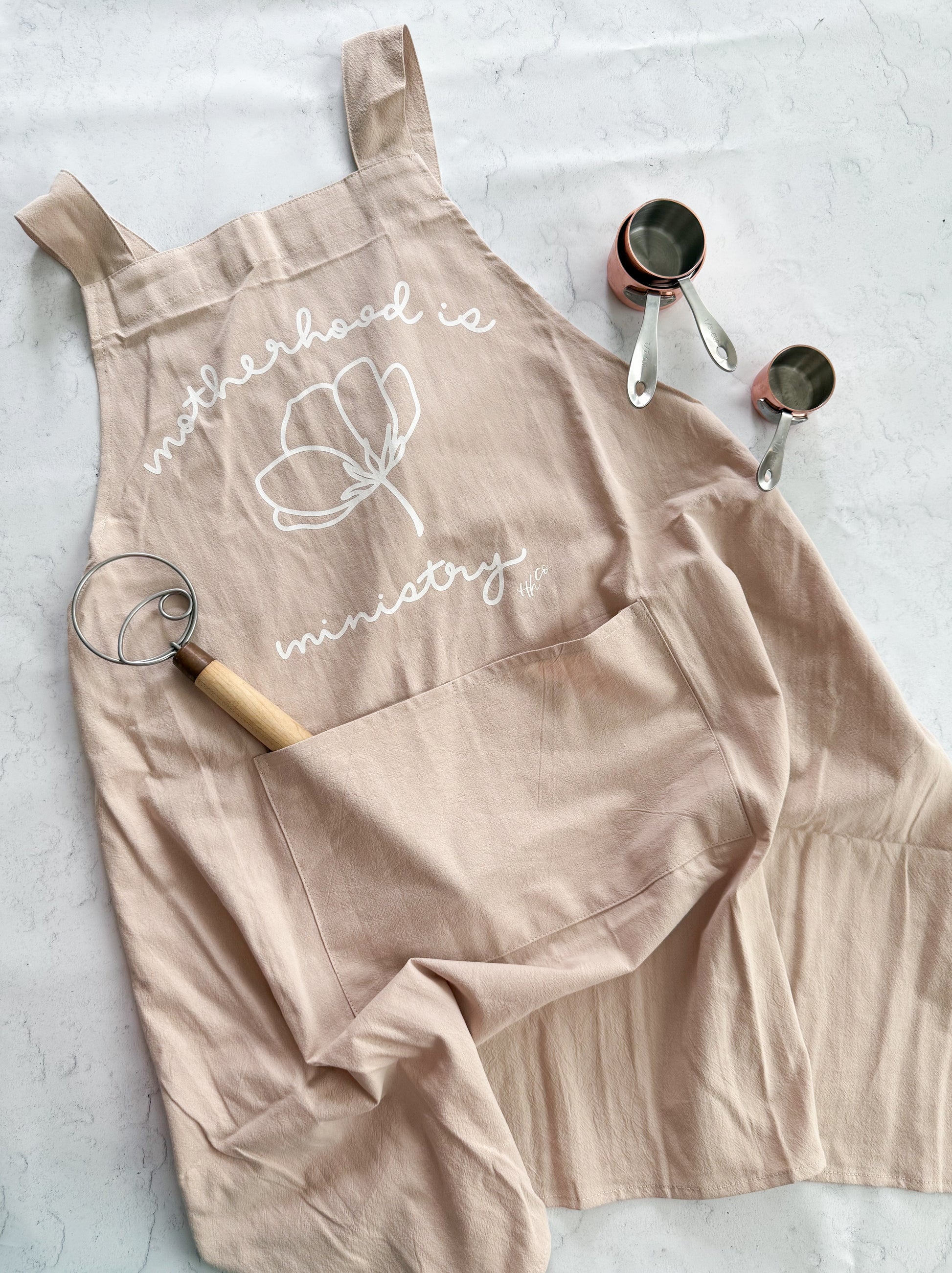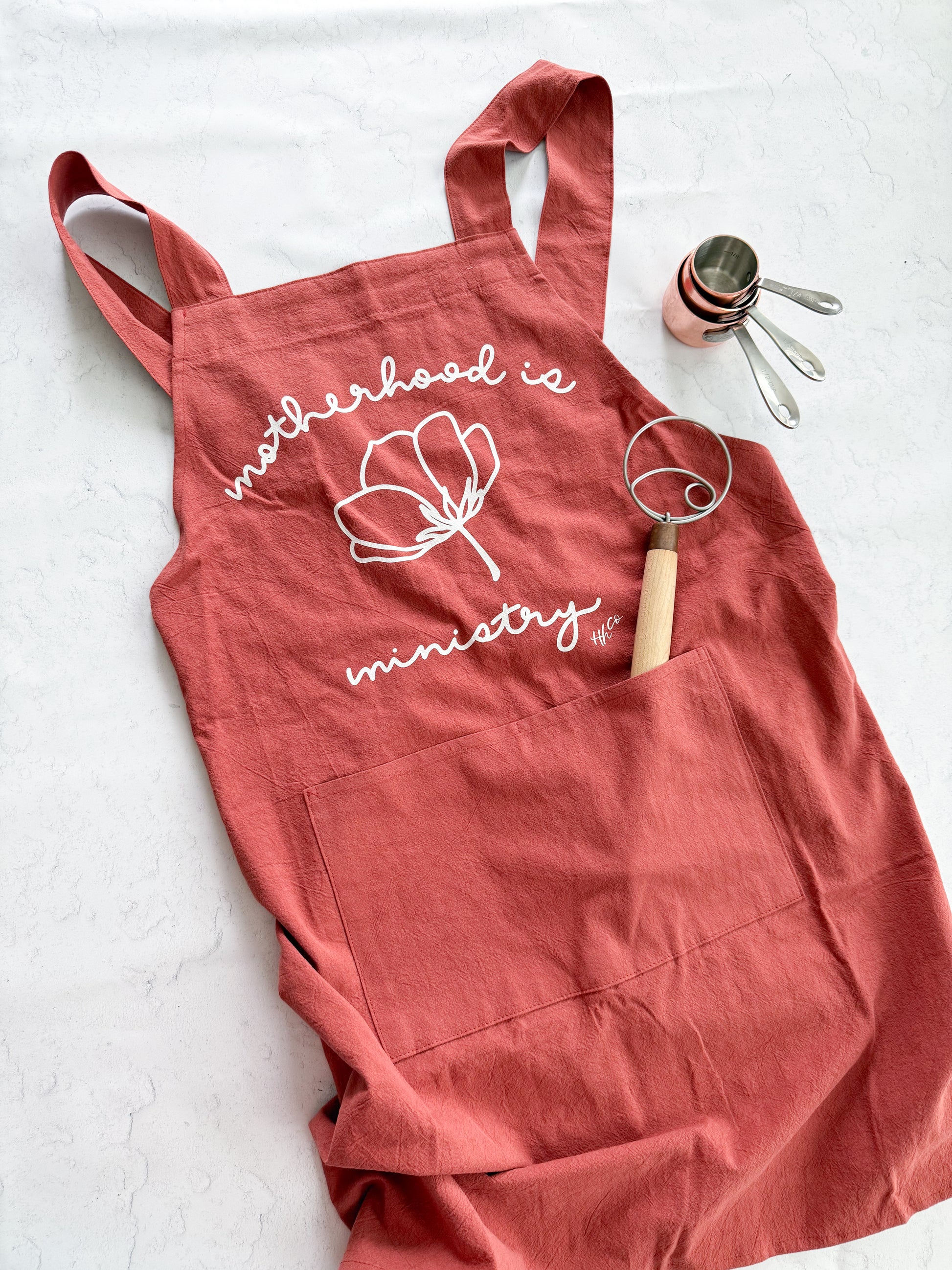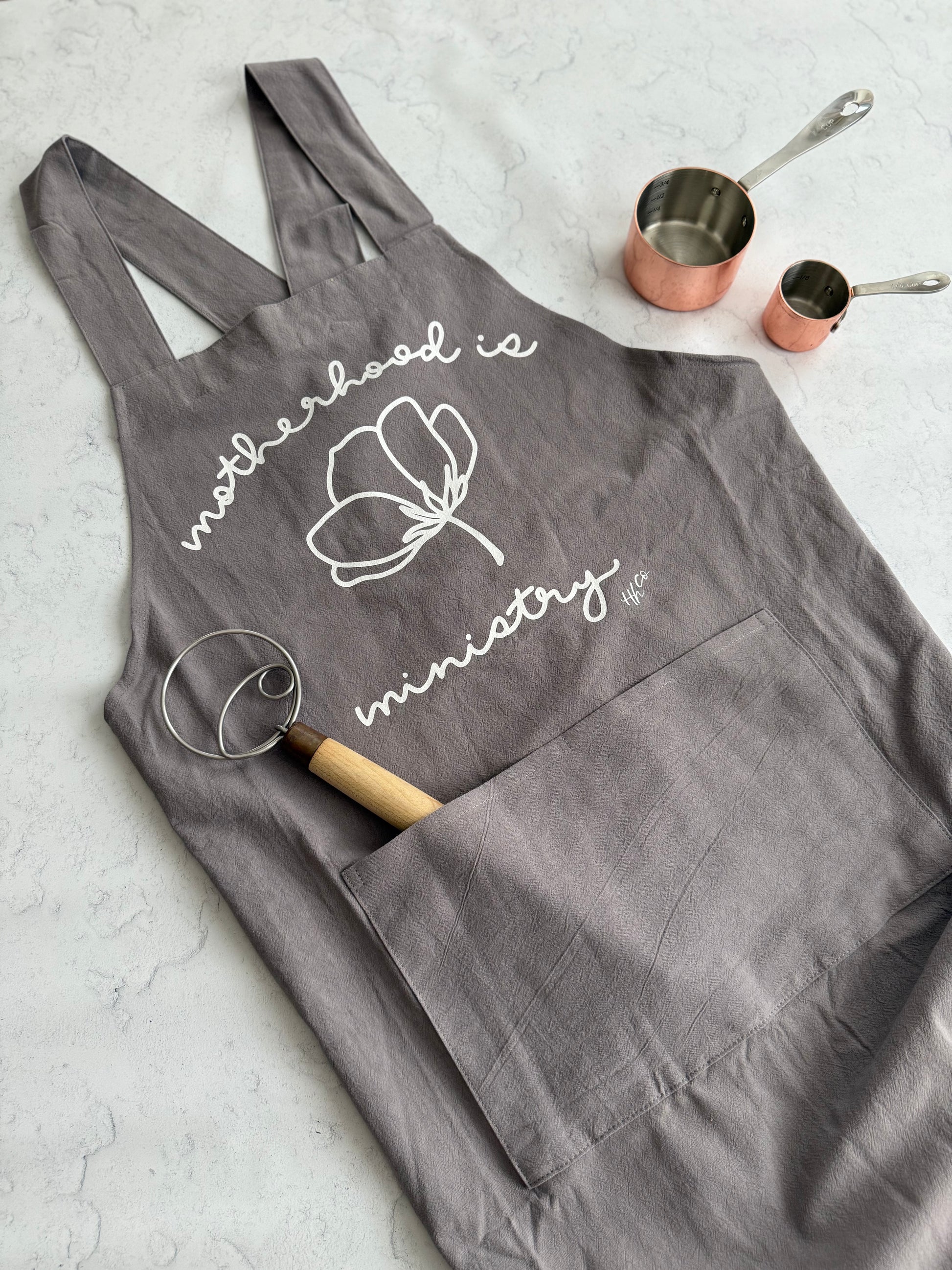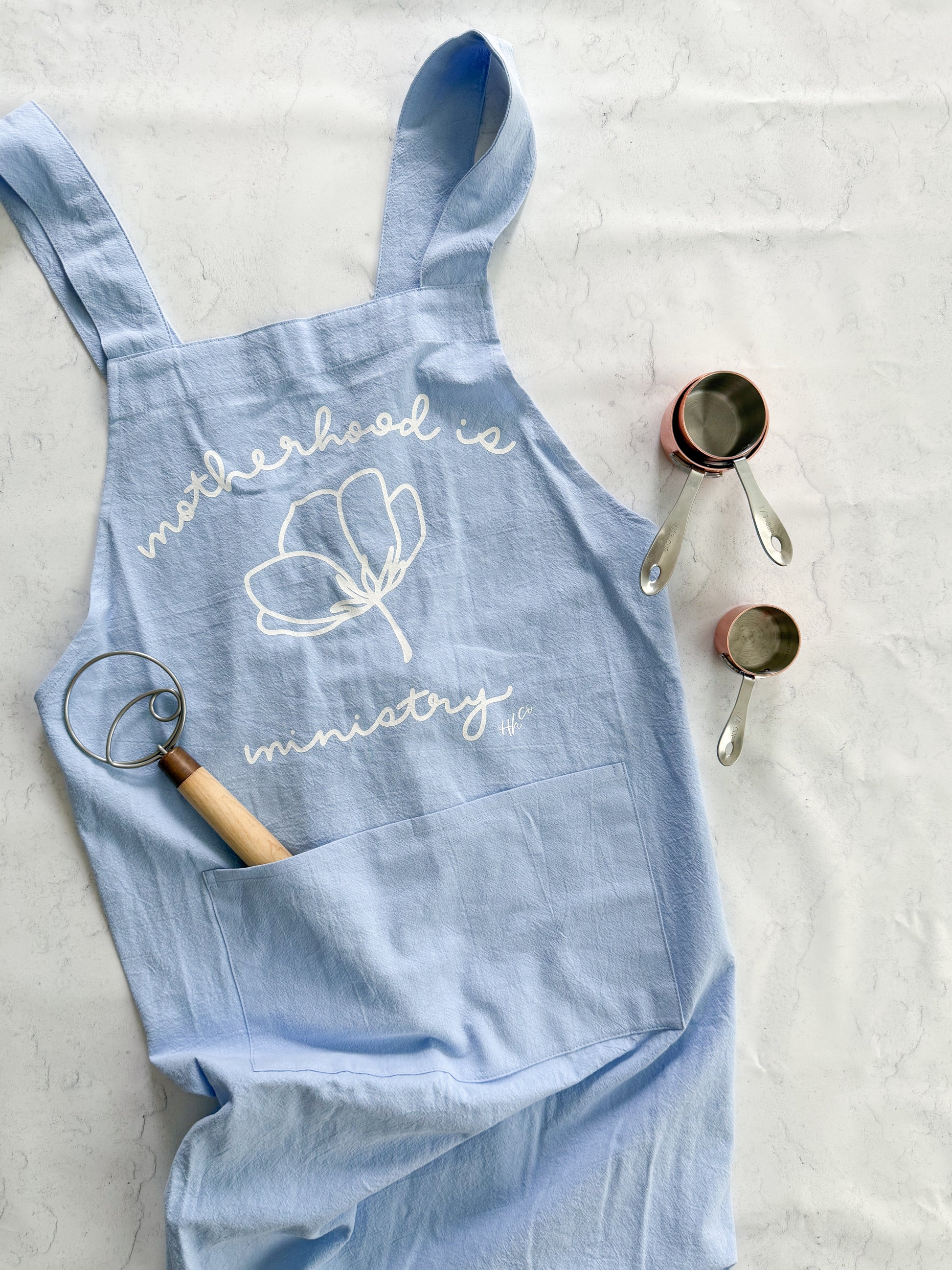 The versatile, light weight, cross back cotton apron is great for cooking, painting, cleaning, and everything in between! The cross back design is easy-on and easy-off, no strings attached. Our “Motherhood is Ministry” design is the perfect reminder as you go about your daily tasks at home!