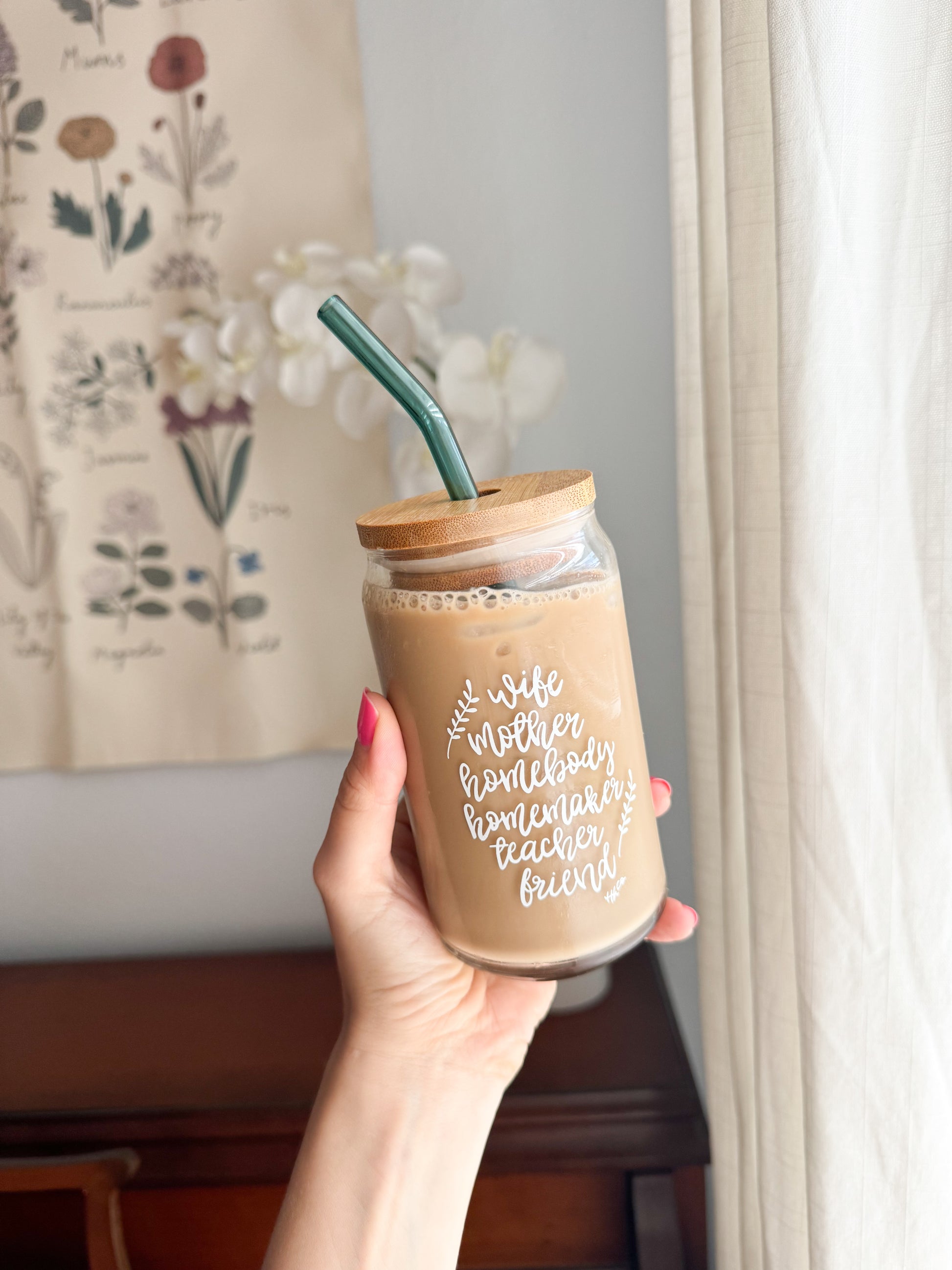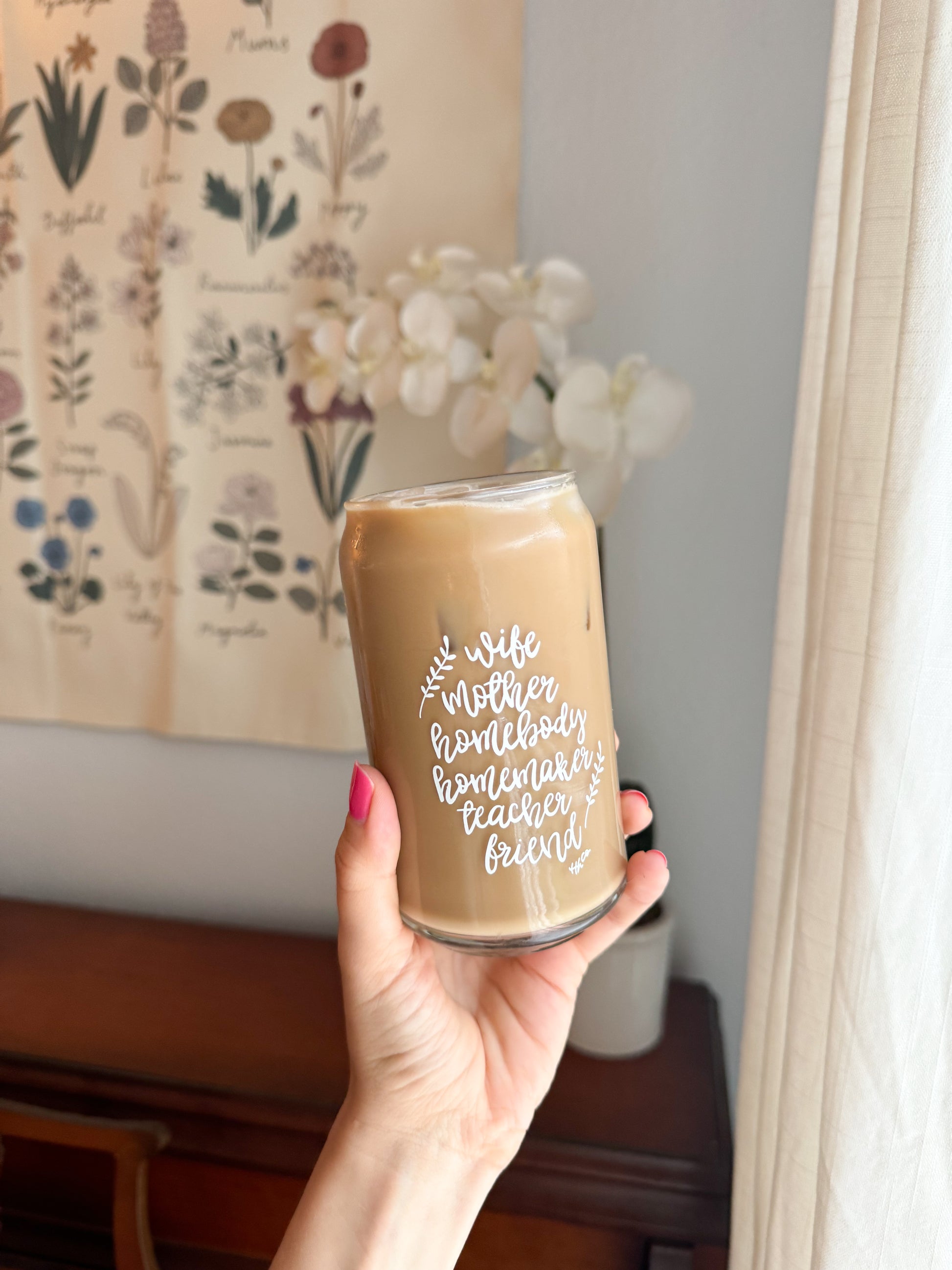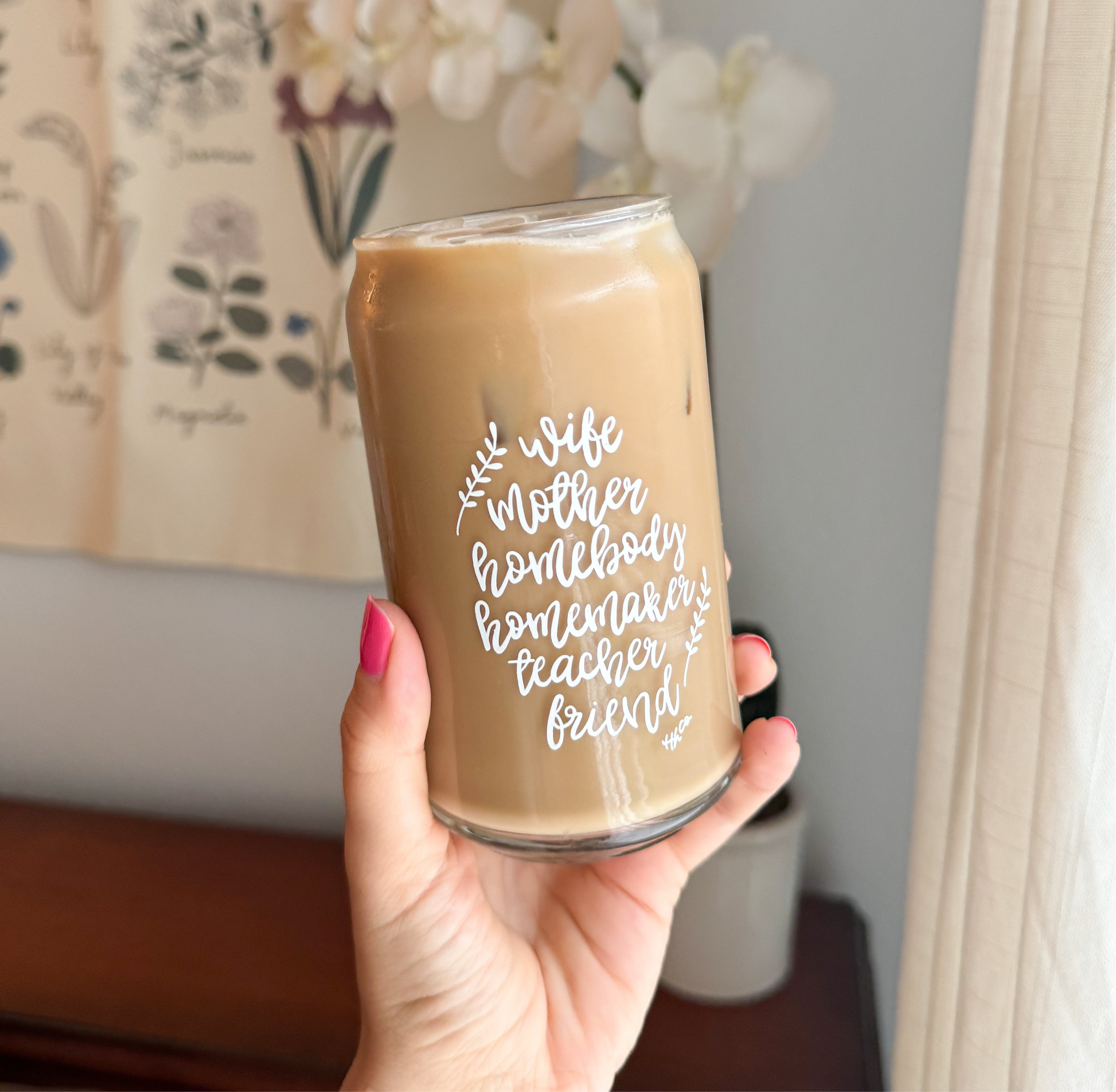 Iced coffee? Tea? Juice? The options are endless in this gorgeous 16oz glass cup! This cup includes some of my favorite titles - “wife, mama, homemaker, homebody, teacher, friend.” I hope you enjoy this glass yourself or gift it to a friend or loved one in your life!